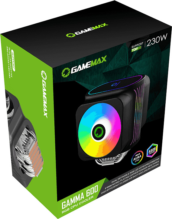 GameMax Кулер для процессора Gamma 600В данный момент этот товар отсутствует в продаже. Возможно, у нас найдется аналогичный или похожий товар здесь. Кулер для процессора GameMax Gamma 600 относится к числу универсальных моделей и отличается совместимостью с центральными процессорами на сокетах LGA 1700, 115x, 1200, 2011, 2066, FMx и AMx. Такая система охлаждения с максимальной рассеиваемой тепловой мощностью 230 Вт обладает медным основанием, алюминиевым радиатором, 6 тепловыми трубками. |