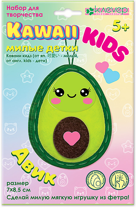 «Каваии-кидз. Авик» — набор для изготовления мягкой игрушки-авокадо из цветного фетра с трогательным личиком. Дети старше 5 лет научатся шить простую мягкую игрушку, освоят «прямые» стежки, познакомятся с техникой «набивания» игрушки, используют скотч вместо клея, ощутят кончиками пальчиков разные тактильные материалы. Результат работы — милый авокадо «Авик» — первая мягкая игрушка, сделанная своими руками.