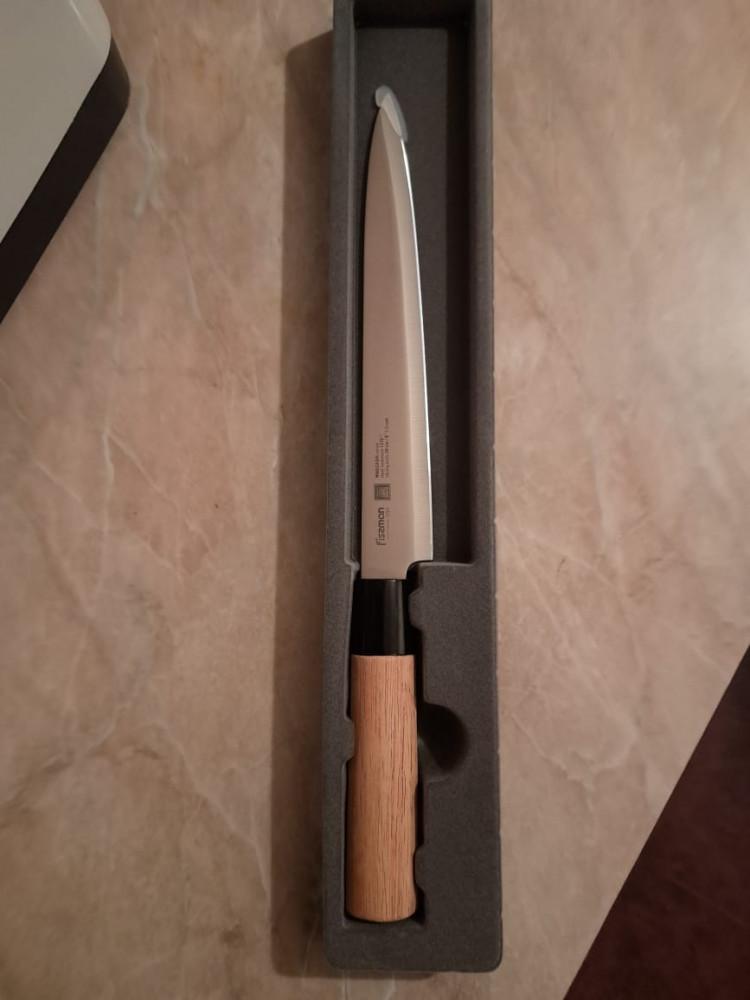 Купила сначала один, сын выпросил... Пришлось покупать второй, потому что это была любовь с первого взгляда. Лезвие практически не гнется, рукоять выполнена из цельного куска дерева - ну очень дорого/богато смотрится, очень острый, в руке лежит удобно...и так далее, и тому подобное :)) А главное - цена просто смешная. Теперь есть желание купить все ножи из этой серии. Крутотень