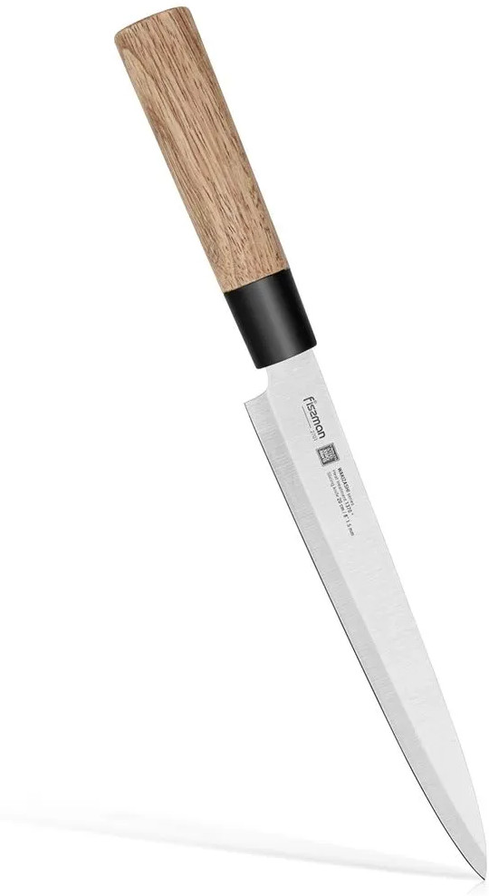Fissman Нож гастрономический «Wakizashi»В данный момент этот товар отсутствует в продаже. Возможно, у нас найдется аналогичный или похожий товар здесь. Серия: Wakizashi Гастрономический нож — выбор знатоков. Он подойдет для нарезки любых продуктов на идеально тонкие кусочки благодаря длинному и узкому лезвию. Он пригодится и для приготовления блюд японской кухни — суши и сашими. Кухонные ножи серии «Wakizashi» выполнены из высоколегированной немецкой стали X50CrMoV15, закаленной до 57 единиц по шкале Роквелла и имеют множество преимуществ. |