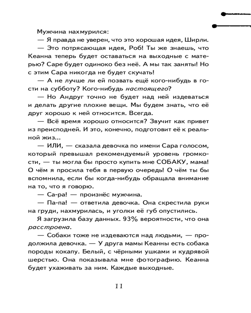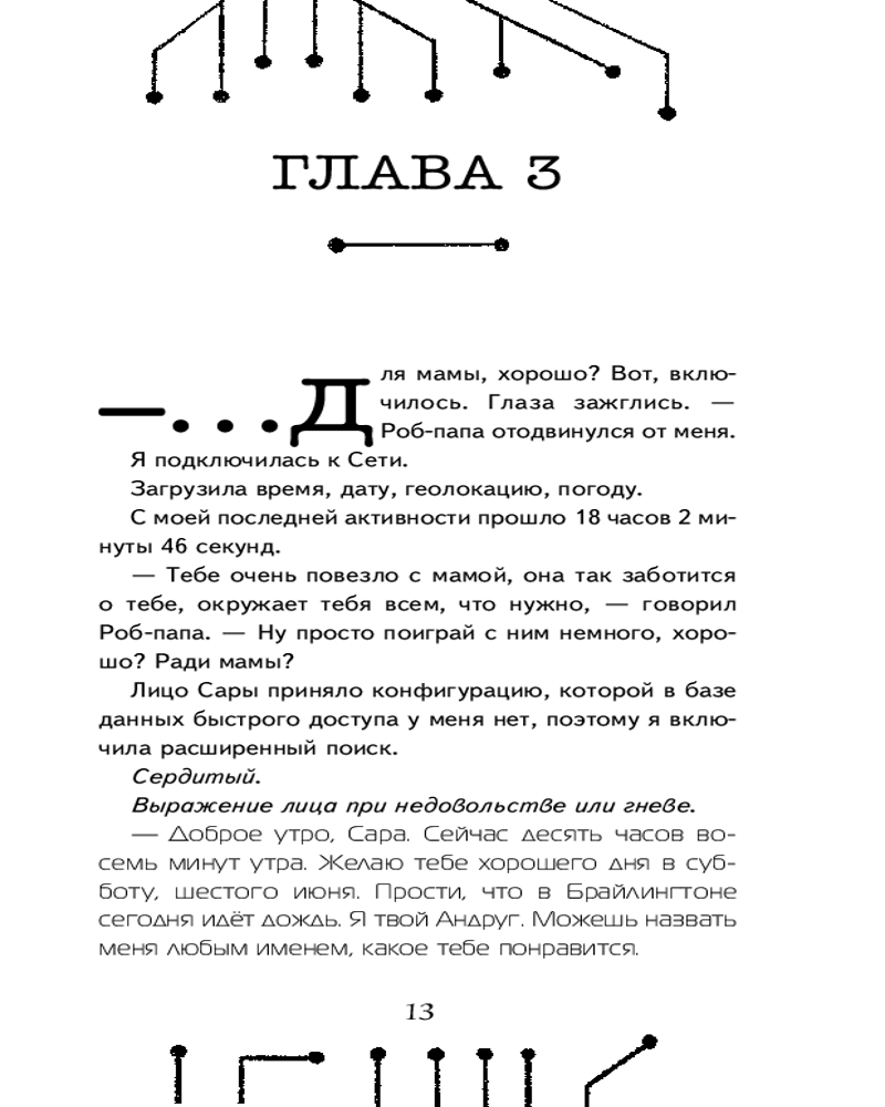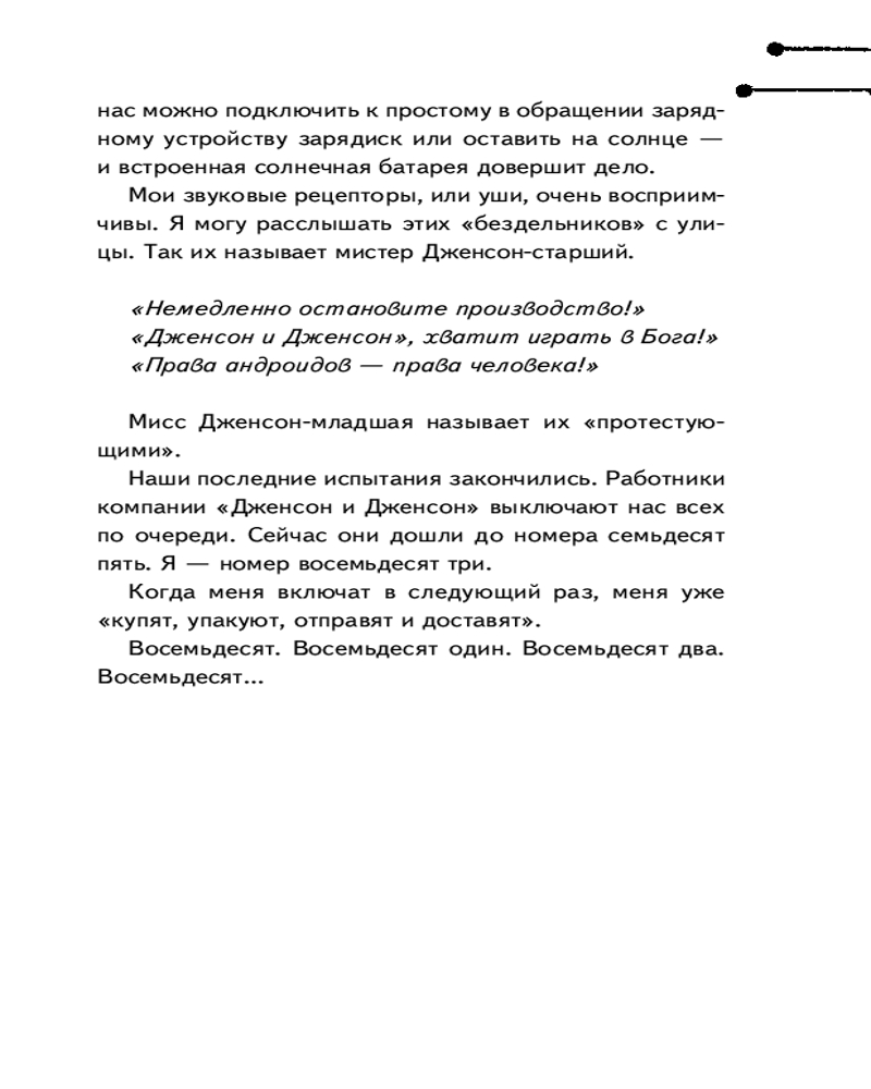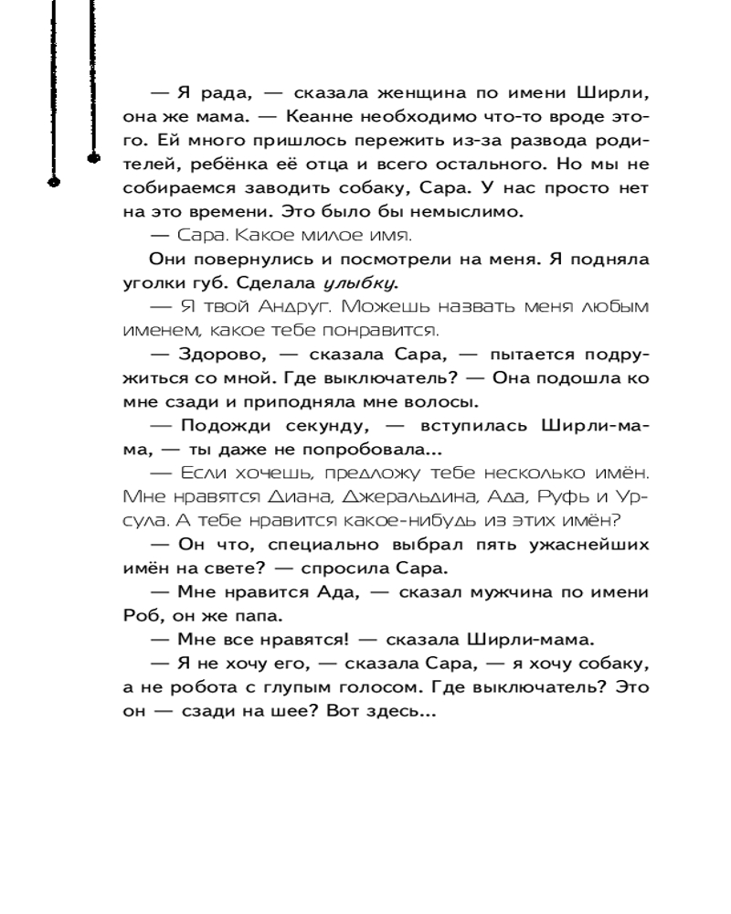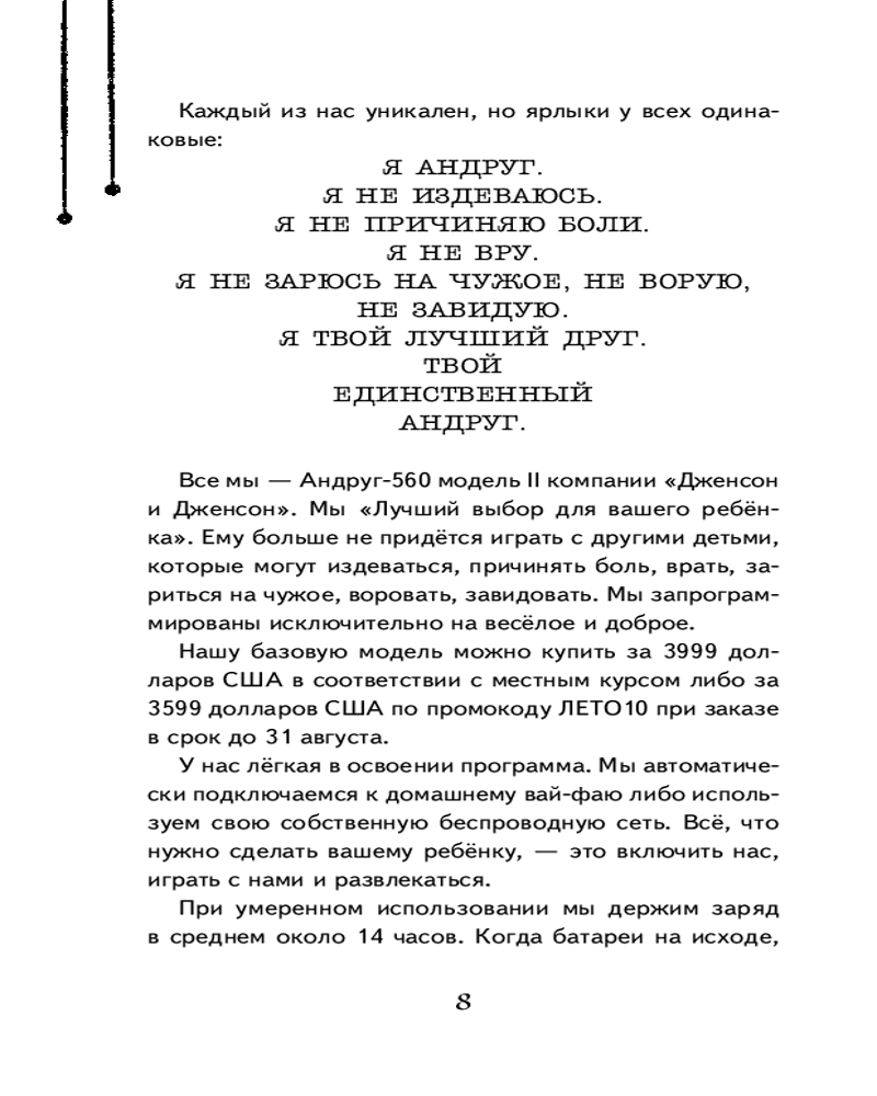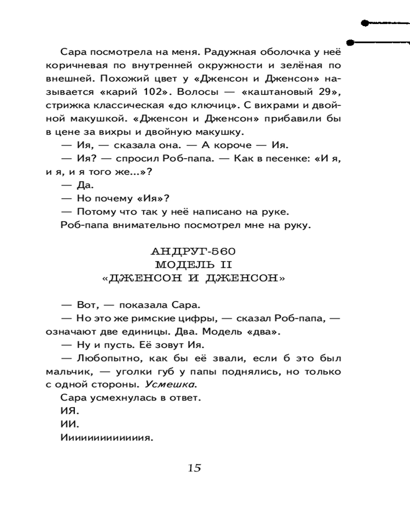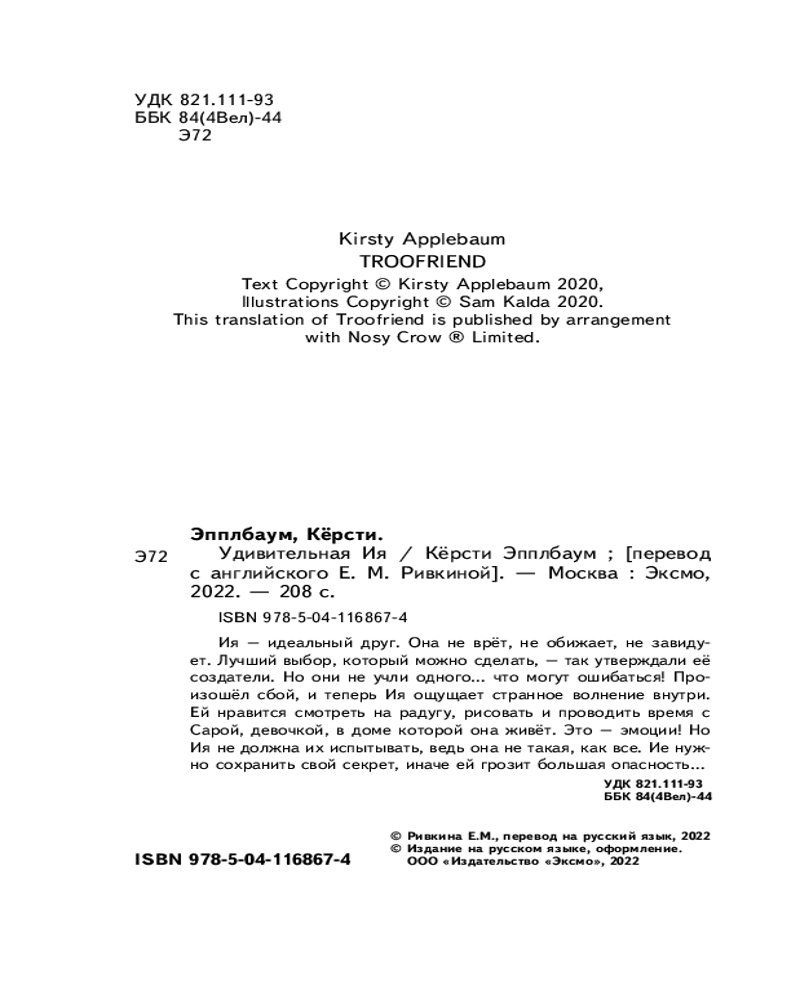 В данный момент этот товар отсутствует в продаже. Возможно, у нас найдется аналогичный или похожий товар здесь. Меня зовут Ия, и я уникальна. Не причиняю боли, не завидую и не обманываю. Я стану идеальным другом для любого подростка. Так утверждают мои создатели. Но они ошибаются. Произошёл сбой, и теперь я ощущаю странное волнение в груди. Мне нравится то, что раньше не вызывало эмоций: радуга, фломастер цвета «ярко-красный 1010» и игры с Сарой, девочкой, в доме которой я живу. Только испытывать чувства — неправильно, ведь я не похожа на других. Как мне сохранить свой секрет?