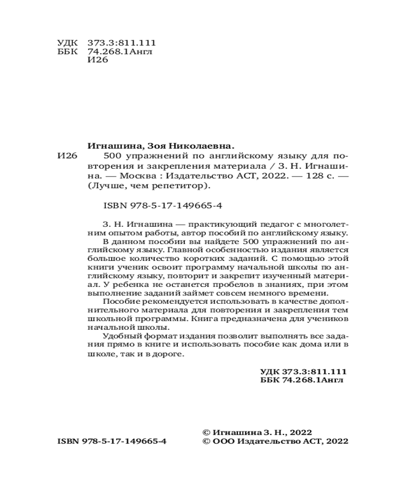💳 Оплатить за товар можно при получении 🇰🇿 Есть бесплатная доставка по Казахстану от 1 дня 🎁 Копите бонусы с каждой покупки В данном пособии вы найдете 500 упражнений по английскому языку. Главной особенностью издания является большое количество коротких заданий. С помощью этой книги ученик освоит программу начальной школы по английскому языку, повторит и закрепит изученный материал. У ребенка не останется пробелов в знаниях, при этом выполнение заданий займет совсем немного времени. |