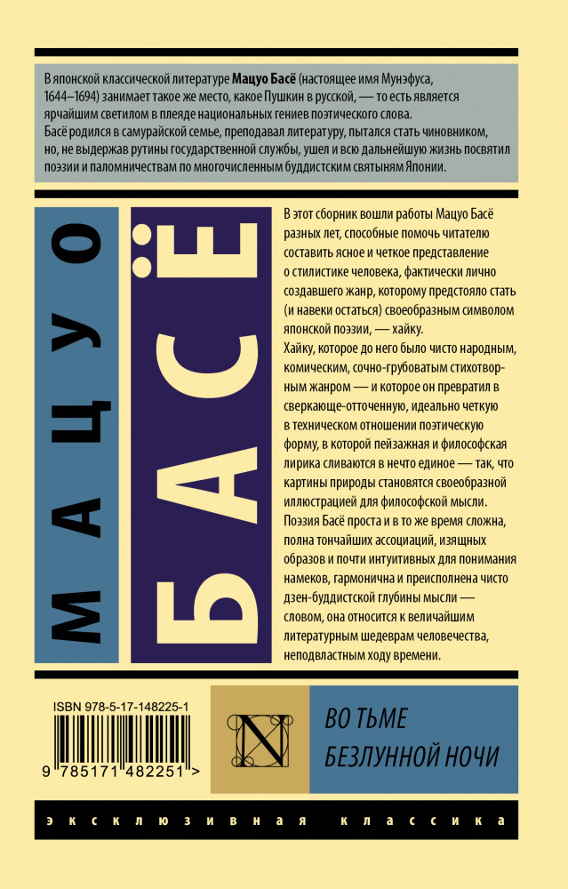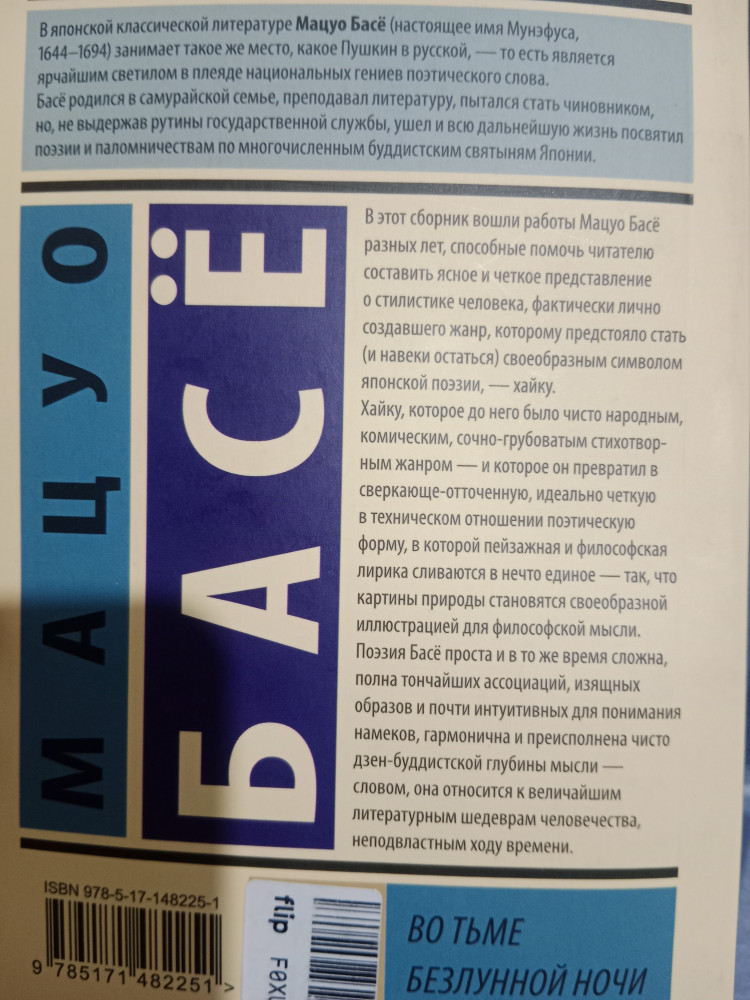 💳 Оплатить за товар можно при получении 🇰🇿 Есть бесплатная доставка по Казахстану от 1 дня 🎁 Копите бонусы с каждой покупки Серия: Эксклюзивная классика В этот сборник вошли работы Мацуо Басё разных лет, способные помочь читателю составить ясное и четкое представление о стилистике человека, фактически лично создавшего жанр, которому предстояло стать (и навеки остаться) своеобразным символом японской поэзии, — хайку. |
