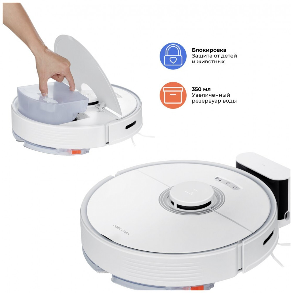 Объединение мусорного бака и резервуара для воды в один блок увеличивает их вместимость. Это также упрощает опорожнение мусорного ведра и заправку бака за одну поездку. Максимальная площадь влажной уборки — 240 кв.м, при емкости резервуара для воды 350 мл, площадь сухой уборки — 300 кв.м, емкость пылесборника — 470 мл.