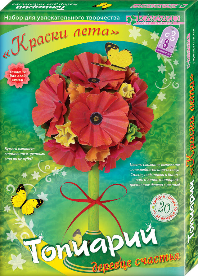 Клевер Набор для творчества «Краски лета»В данный момент этот товар отсутствует в продаже. Возможно, у нас найдется аналогичный или похожий товар здесь. Серия: Топиарий Деревце — топиарий могут сделать дети от 8-ми лет, — это несложно и увлекательно: сначала изготавливаются из бумаги цветы, а к ним дополнительные детали: бумага нарезается, складывается, подрезается или скручивается. Затем из картона складывается основа для кроны и изготавливается ствол и подставка. Собрав все картонные детали, украшаем шарообразную крону цветами и бабочками, завитками-листиками, а ствол — яркой атласной лентой. Декоративные деревья, созданные в технике «Бумагопластика», словно из волшебного сада, появятся у вас в доме и будут украшать его круглый год! |