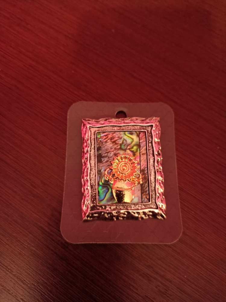 Заказала в подарок. Этакая картина, на одежду из плотной ткани. Прикольная брошь, не понравилось, что на ракушечном фоне черная полоса, смотрится, как будто фон сделан внахлест из двух частей, хотя это не так, типа, оптическая иллюзия.