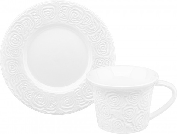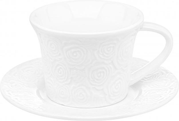 Чайная пара серии «Розы» состоит из 2-х предметов: чашка на 220 мл и блюдце диаметром 15 см. Используйте набор как чайный или кофейный. Чашка с блюдцем помогут провести множество вкусных завтраков с капучино или латте или уютных вечеров с любимым горячим напитком. Набор выполнен из высококачественного белого фарфора и украшен декоративными рельефными узорами. Фарфоровая посуда отличается от керамики повышенной плотностью. Фарфор не впитывает цвет кофе или чая и не деформируется от влаги, чему может быть подвержена керамическая посуда.