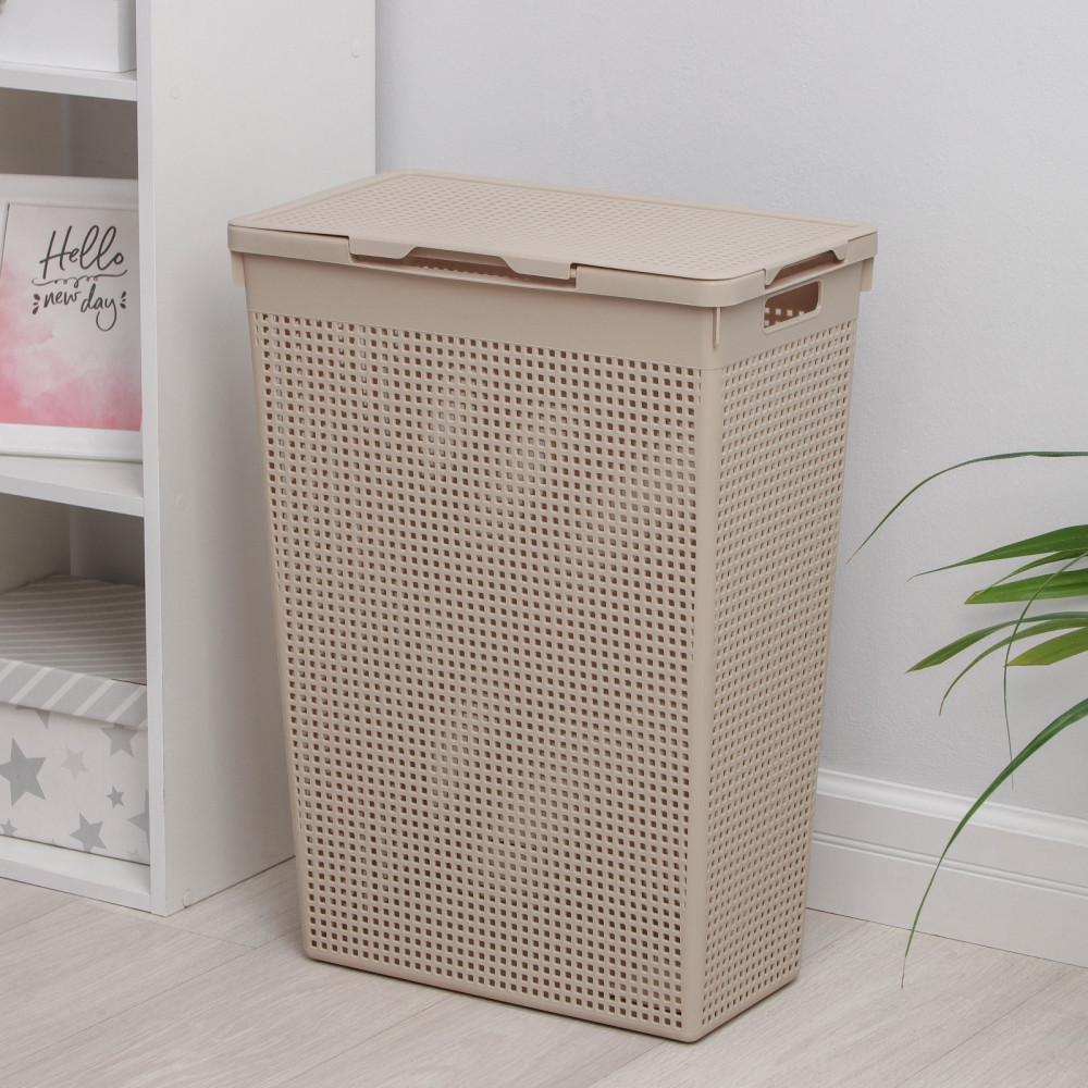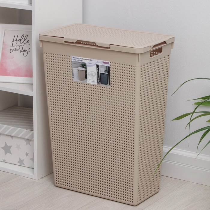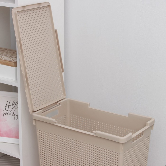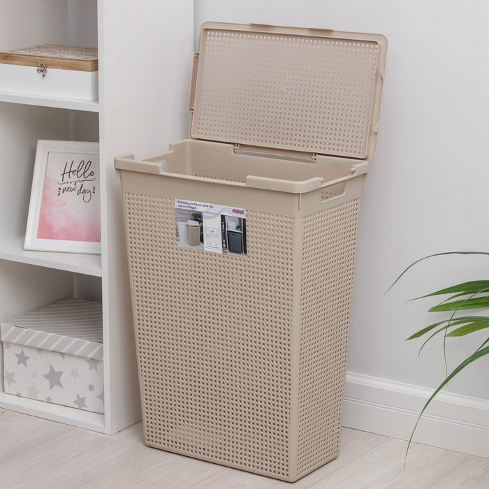 Классная корзина, крышку можно установить на любую сторону, как удобно. Корзинка сетчатая, не будет запаха затхлого белья.