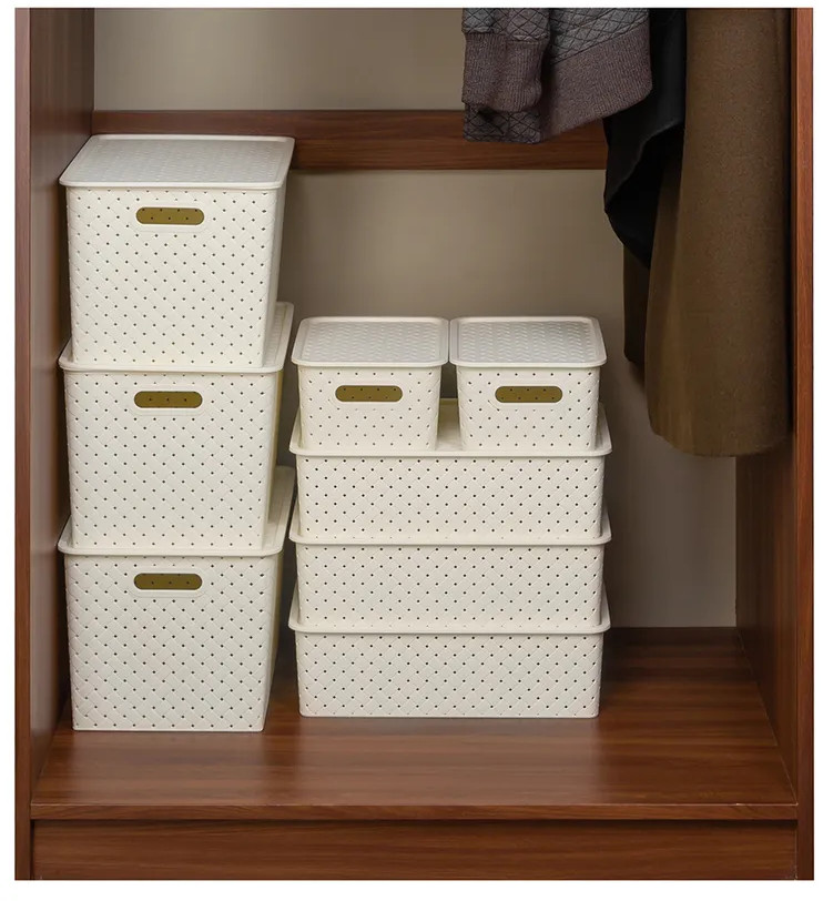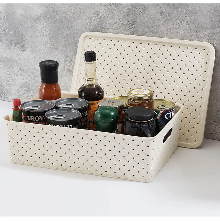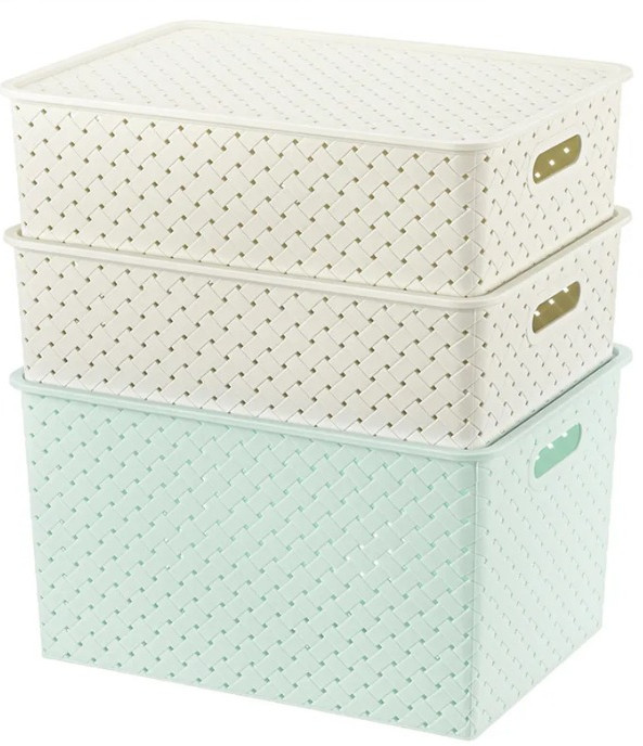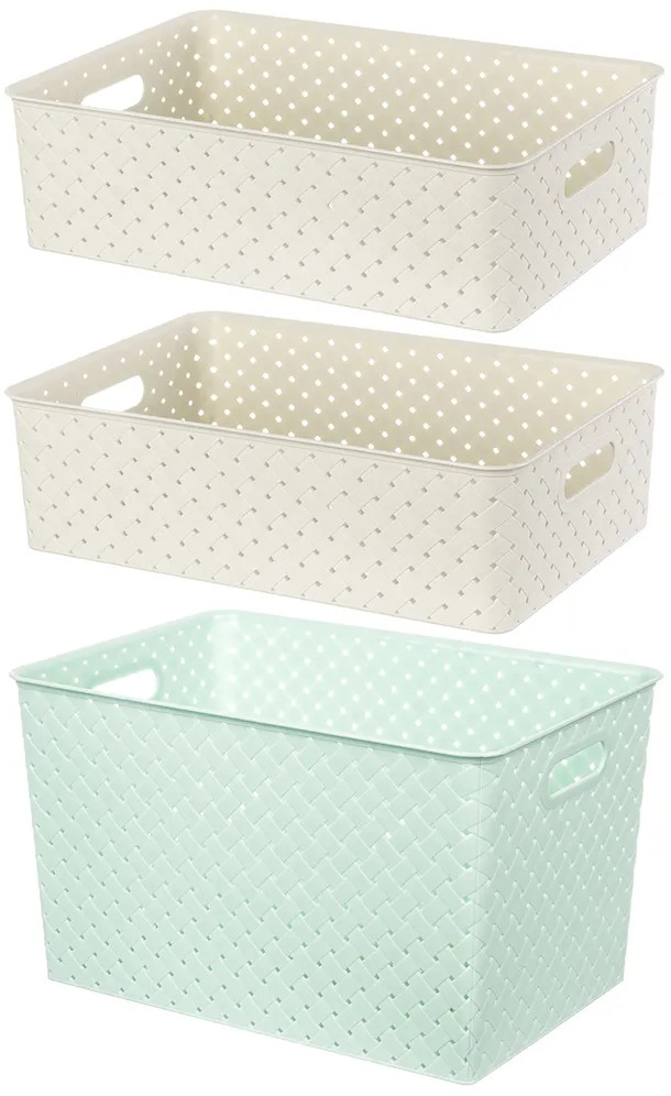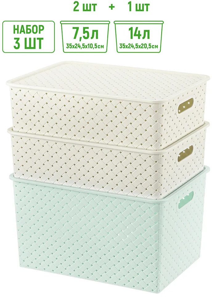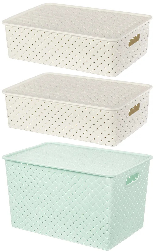 Корзинки объемом 7,5 литра и 14 литров с крышкой выполнены из качественного прочного пластика с двумя ручками-выемками. Крышка плотно закрывается, а специальное плетение с дырочками позволяет воздуху проникать внутрь и не дает продуктам испортиться от недостатка кислорода. В корзинке можно хранить как овощи и фрукты, так и хозяйственные предметы. Крышки корзинки сконструированы таким образом, что корзинки разных размеров можно удобно и надежно разместить друг на друге, составив удобный и функциональный набор. Корзинки представлены разных объемов, форм и расцветок, что позволит собрать уникальный набор, подходящий под ваши потребности.