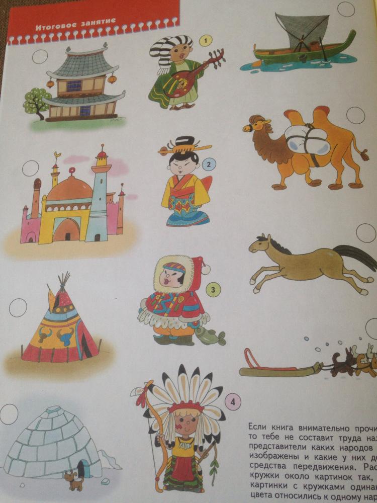Очень жаль, что нет возможности просмотреть всю книгу перед покупкой. В книге есть описание всего шести народов, по одной странице на каждый, рисунки в виде иллюстраций, на мой взгляд, не совсем удачные - их слишком мало, они маленькие и чересчур стилизованные, поэтому для ребенка различия не ярко выражены и понятны - фото в этом плане, конечно, лучше. Один разворот - игра. Есть несколько наклеек.