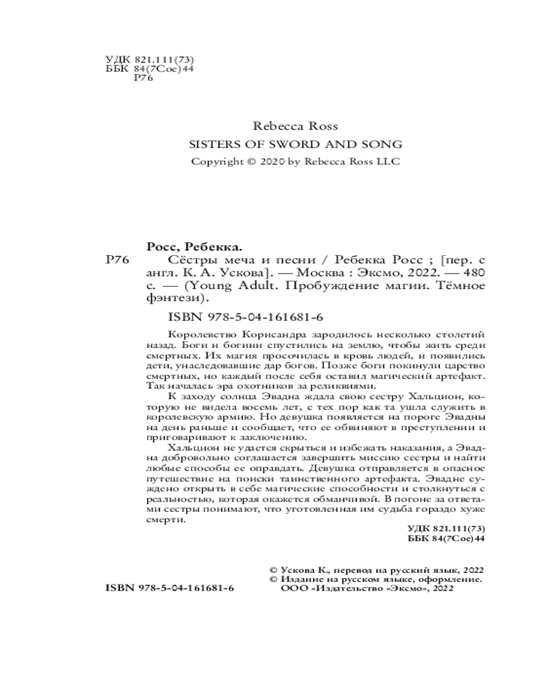 Сёстры меча и песниВ данный момент этот товар отсутствует в продаже. Возможно, у нас найдется аналогичный или похожий товар здесь. Серия: Young Adult. Коллекция фэнтези. Магия темного мира Королевство Корисандра зародилось несколько столетий назад. Боги и богини спустились на землю, чтобы жить среди смертных. Их магия просочилась в кровь людей, и появились дети, унаследовавшие дар богов. Позже боги покинули царство смертных, но каждый после себя оставил магический артефакт. Так началась эра охотников за реликвиями. |