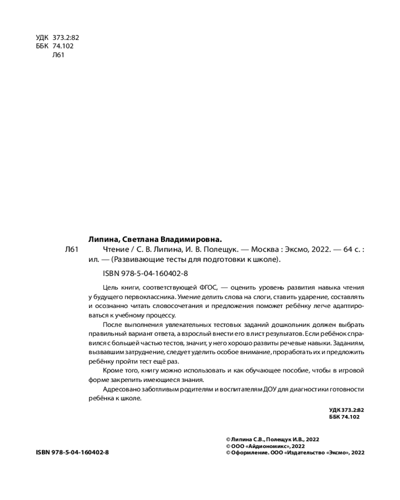 Развивающие тесты для подготовки к школе. ЧтениеСветлана Владимировна Липина, Ирина Владимировна Полещук -20% +16