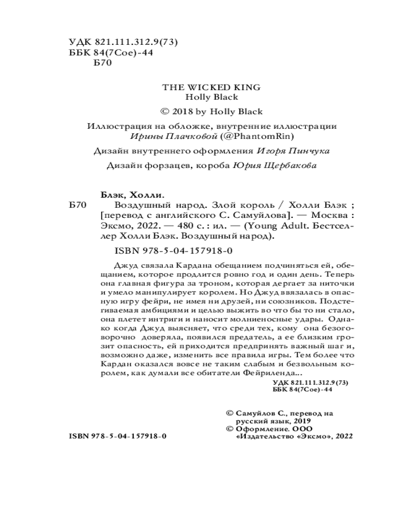 | Холли Блэк (Holly Black, урожденная Ридженбах) – американская писательница. Родилась в Нью-Джерси. Еще в школьные годы начала писать стихи, рассказы и пьесы. Окончив школу, вместе со своим другом и будущим мужем Тео Блэком отправилась в Нью-Джерси, где поступила в колледж. Окончив колледж Нью-Джерси со степенью бакалавра английской словесности, Холли решила получить вторую профессию и начала учиться библиотечному делу в школе при государственном университете Раджерс, подрабатывая... |