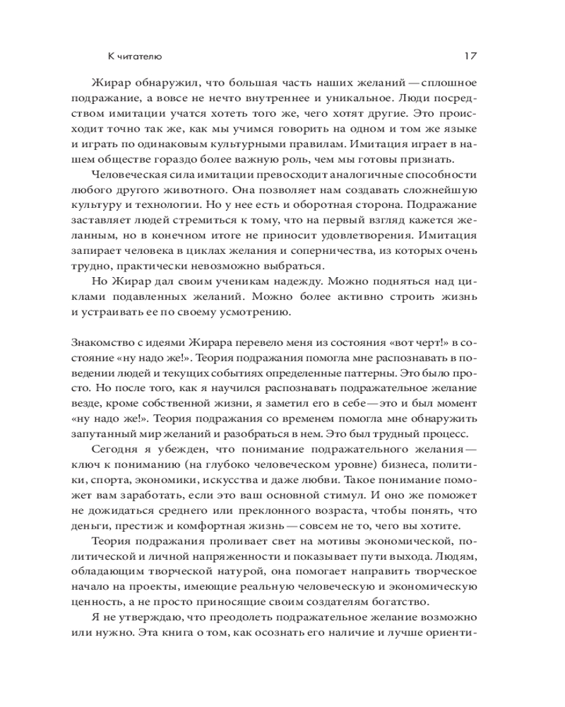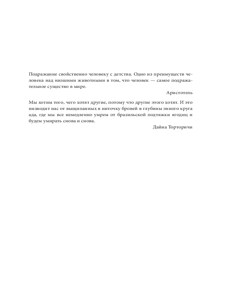 В данный момент этот товар отсутствует в продаже. Возможно, у нас найдется аналогичный или похожий товар здесь. Серия: Психологический бестселлер Люк Берджис опирается на труды французского ученого Рене Жирара и показывает, как «миметическое желание», или стремление к подражанию, формирует нашу жизнь и общество. Нам хочется общаться с кем-то, жить где-то, владеть чем-то и даже обладать определенными качествами личности, потому что этого хотят другие. Мы постоянно чего-то хотим, но лишь немногие пытаются относиться к своим желаниям осознанно. Преподаватель и предприниматель Люк Берджис рассказывает, откуда берутся наши желания, почему так трудно с ними совладать, и раскрывает приемы противодействия деструктивным силам подражательного желания. |