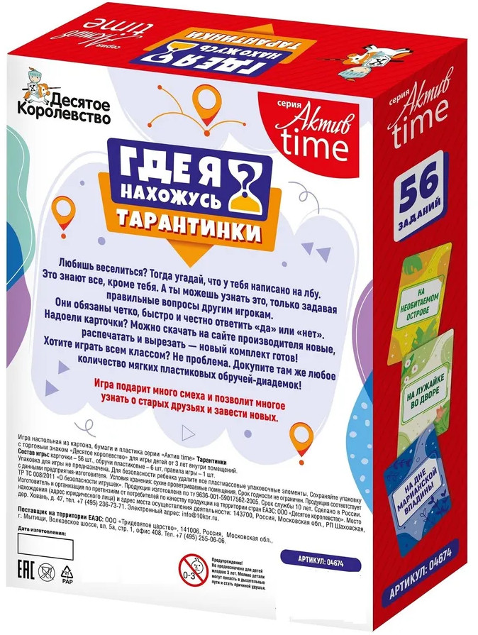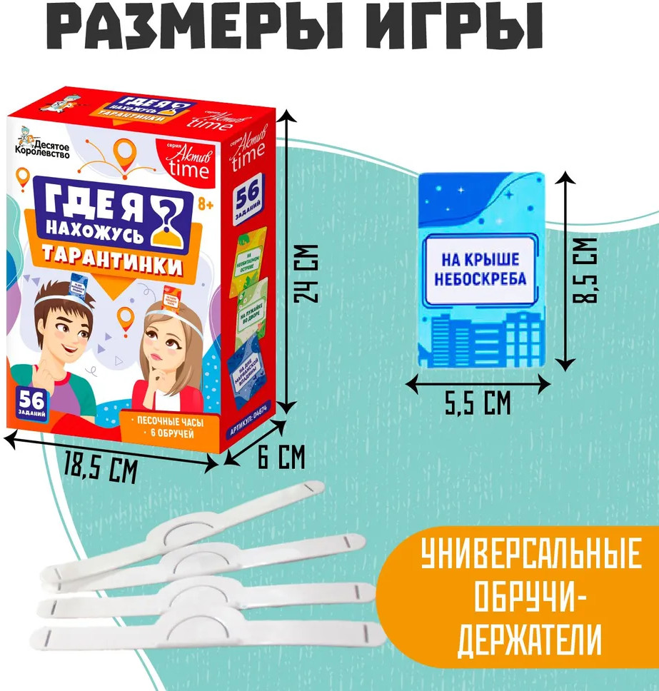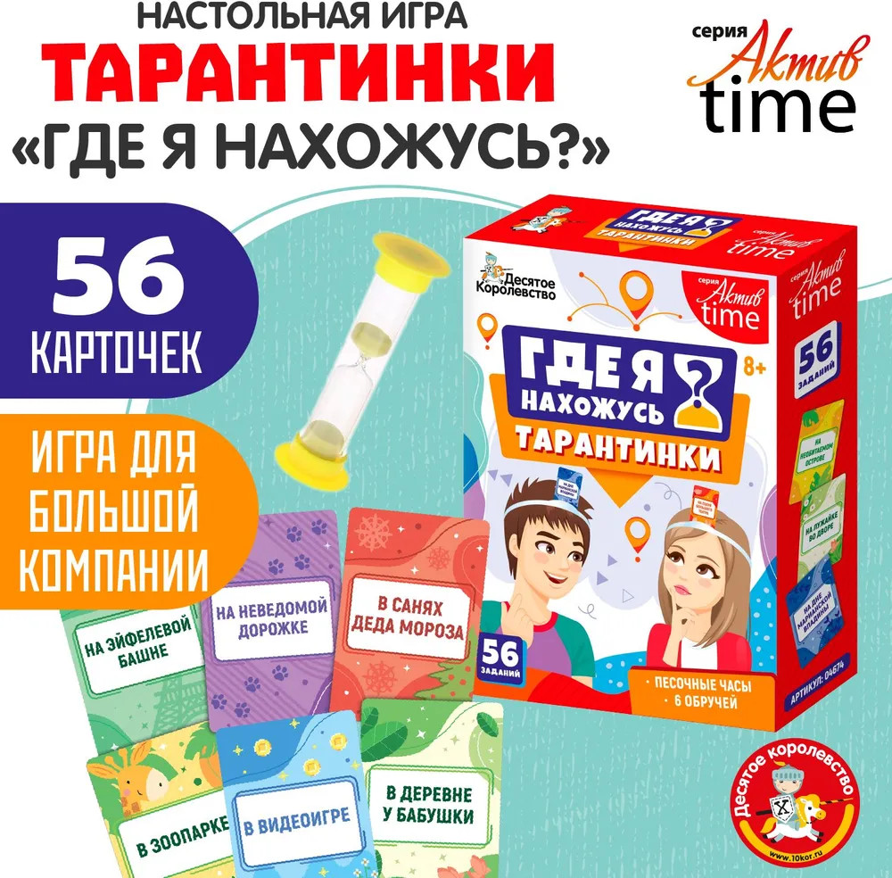 💳 Оплатить за товар можно при получении 🇰🇿 Есть бесплатная доставка по Казахстану от 1 дня 🎁 Копите бонусы с каждой покупки Серия: Актив time Настольная игра «Тарантинки. Где я нахожусь?». Серия Актив time — это командная игра для хорошей компании. Ты должен угадать, что у тебя «написано на лбу», задавая вопросы другим игрокам. А они должны быстро ответить «да» или «нет». При этом карточка с ответом крепится в специальном обруче, который надет на твою голову. |