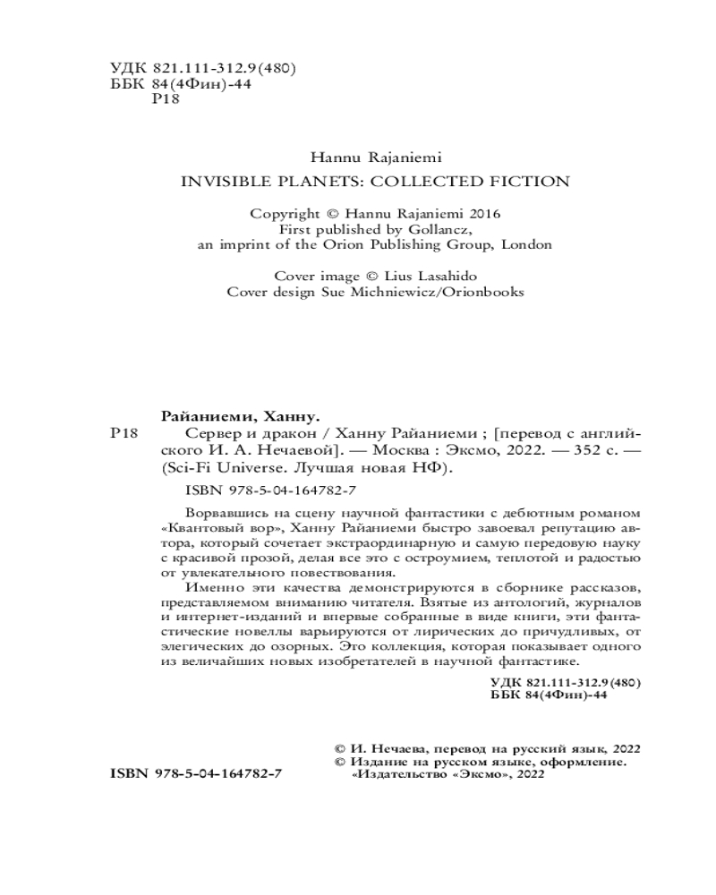 💳 Оплатить за товар можно при получении 🇰🇿 Есть бесплатная доставка по Казахстану от 1 дня 🎁 Копите бонусы с каждой покупки Серия: Fanzon. Sci-Fi Universe. Лучшая новая НФ Сплавляя в своих рассказах несоединимое, Ханну Райаниеми искусно жонглирует мифологией и технологией, воспевая бескрайнюю вселенную, сотканную из битов, которую бороздят темные корабли и драконы. Здесь квантовые стихи-заклинания срываются с губ, превращаясь в быстроногих лосей, человеческая трагедия делает возможным личный разговор с божеством, высятся цифровые соборы, а звезды создаются усилием мысли. |