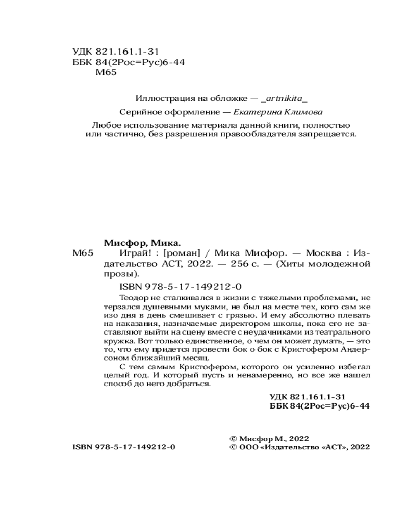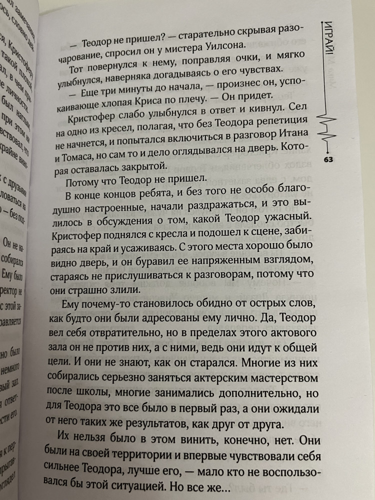 Играй!В данный момент этот товар отсутствует в продаже. Возможно, у нас найдется аналогичный или похожий товар здесь. Серия: Хиты молодежной прозы Теодор не сталкивался в жизни с тяжелыми проблемами, не терзался душевными муками, не был на месте тех, кого сам же изо дня в день смешивает с грязью. И ему абсолютно плевать на наказания, назначаемые директором школы, пока его не заставляют выйти на сцену вместе с неудачниками из театрального кружка. Вот только единственное, о чем он может думать, — это то, что ему придется провести бок о бок с Кристофером Андерсоном ближайший месяц. |
