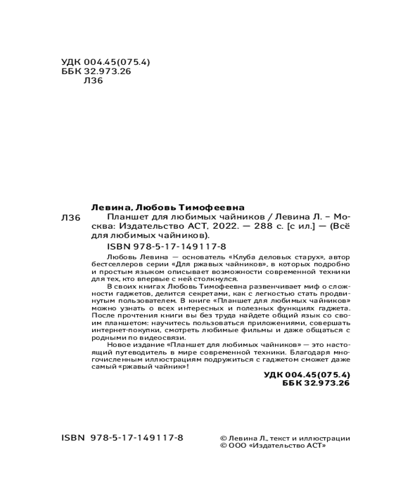 В данный момент этот товар отсутствует в продаже. Возможно, у нас найдется аналогичный или похожий товар здесь. Серия: Всё для любимых чайников Любовь Левина — основатель «Клуба деловых старух», автор бестселлеров серии «Для ржавых чайников», в которых подробно и простым языком описывает возможности современной техники для тех, кто впервые с ней столкнулся.