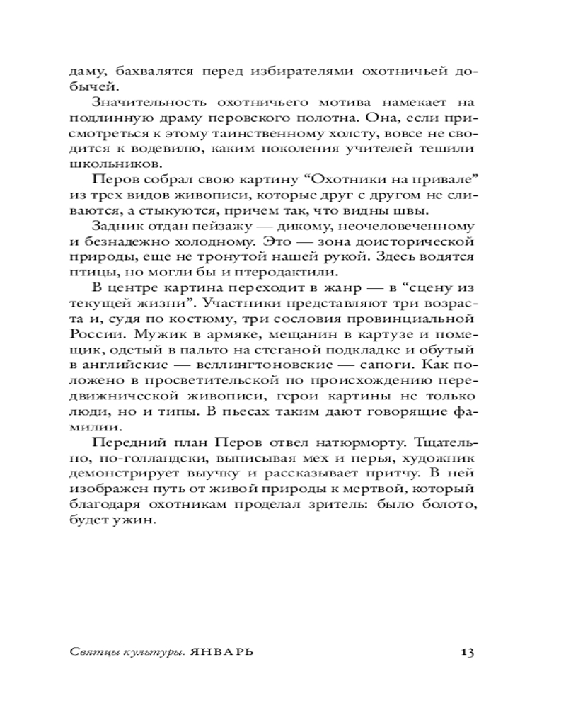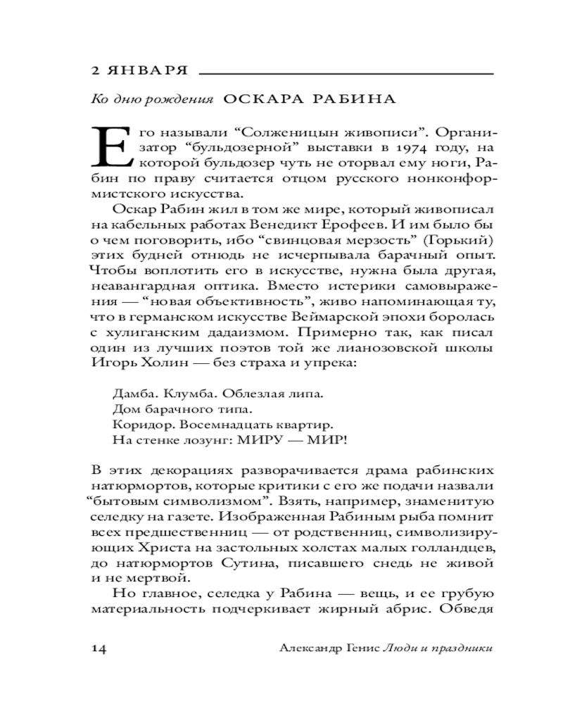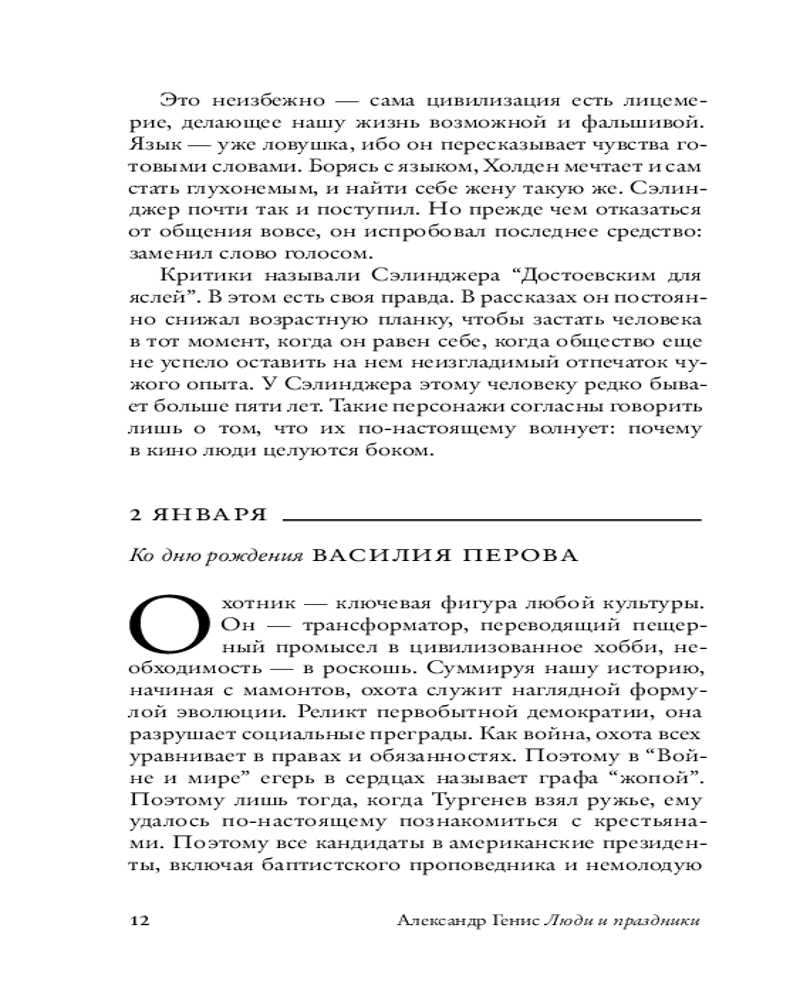 Генис не соревнуется с «Википедией» и тщательно избегает тривиального, предлагая читателю беглую, но оригинальную мысль, неожиданную метафору, незамусоленную шутку, вскрывающее суть определение. Постепенно из календарной мозаики складывается панно, на котором без воли автора отразились его черты. |