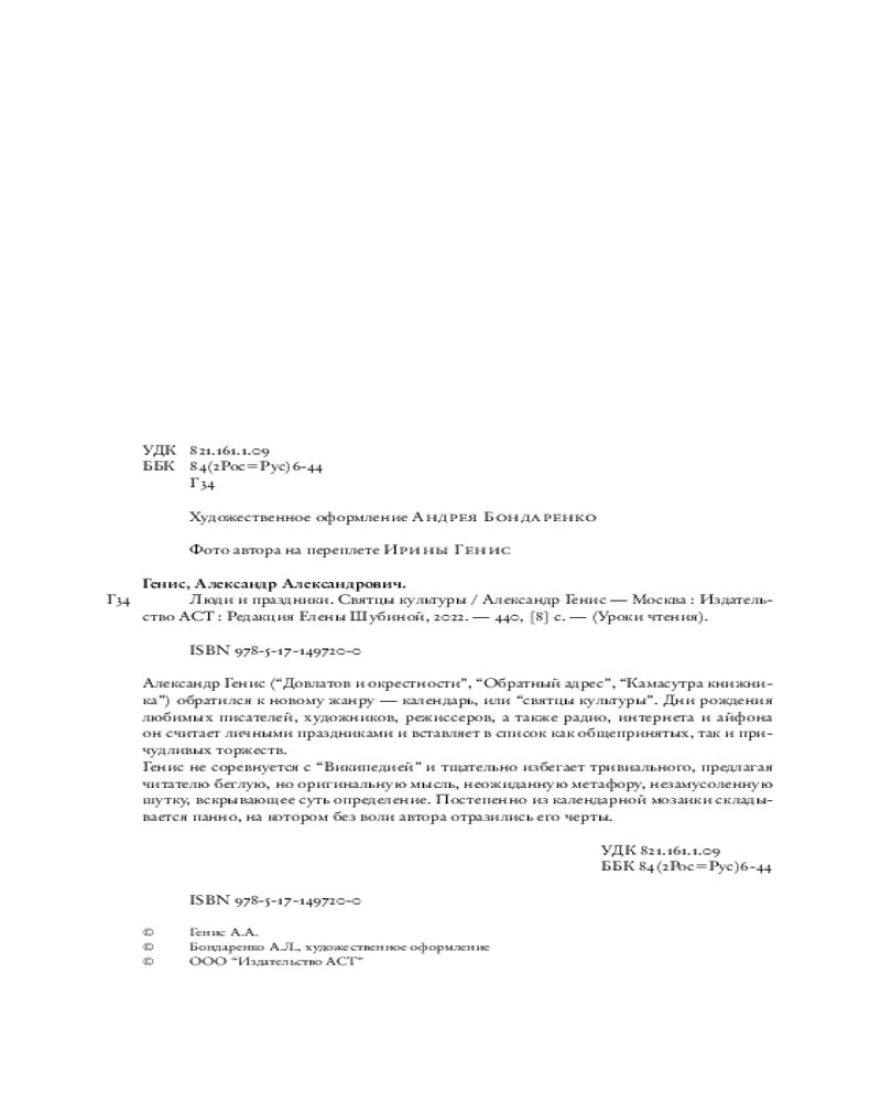 В данный момент этот товар отсутствует в продаже. Возможно, у нас найдется аналогичный или похожий товар здесь. Серия: Уроки чтения Александр Генис («Довлатов и окрестности», «Обратный адрес», «Камасутра книжника») обратился к новому жанру — календарь, или «святцы культуры». Дни рождения любимых писателей, художников, режиссеров, а также радио, интернета и айфона он считает личными праздниками и вставляет в список как общепринятых, так и причудливых торжеств.