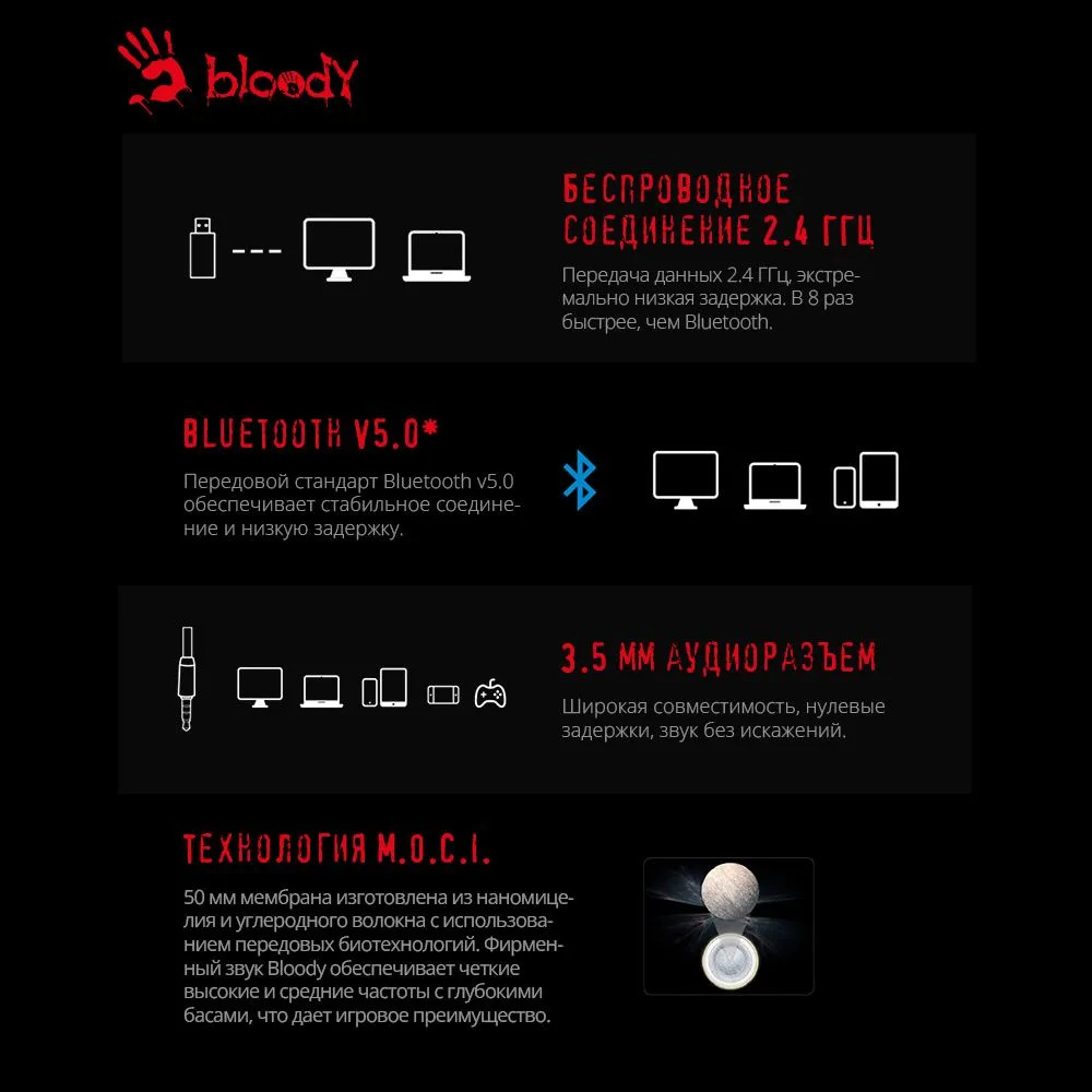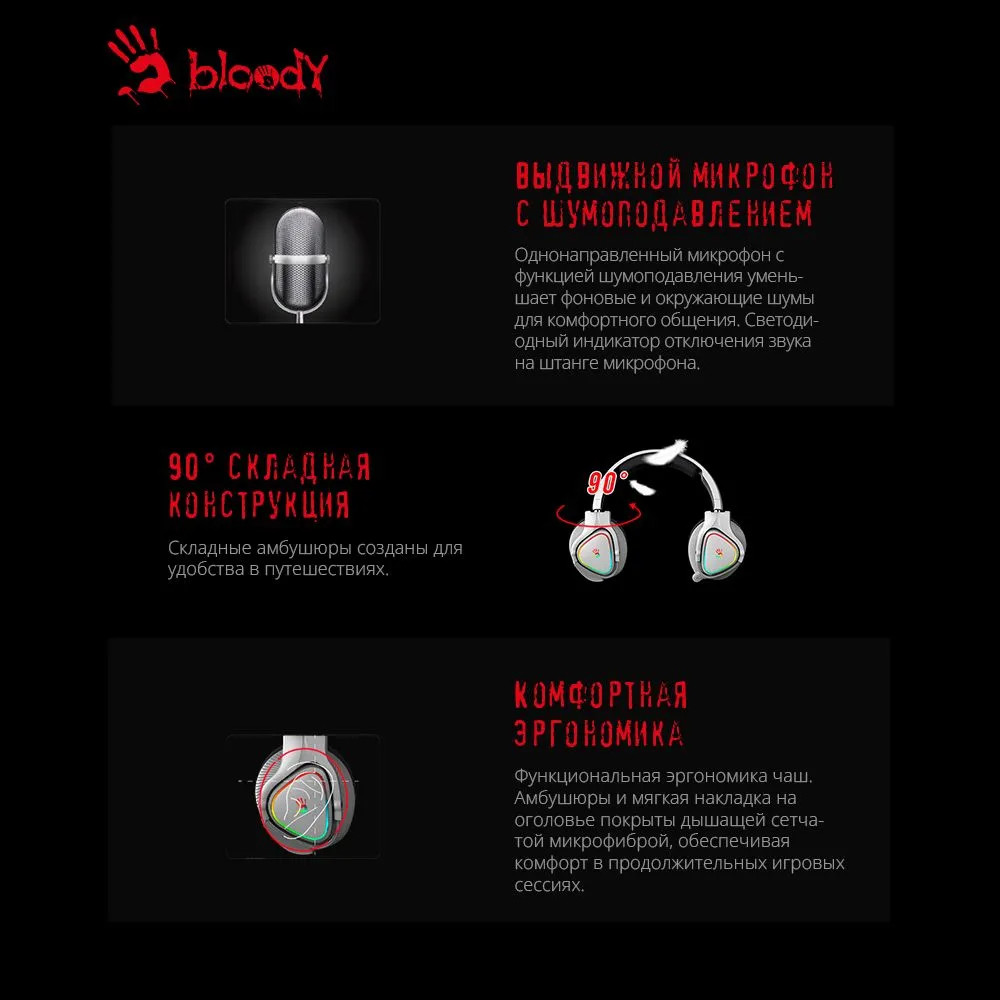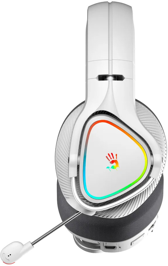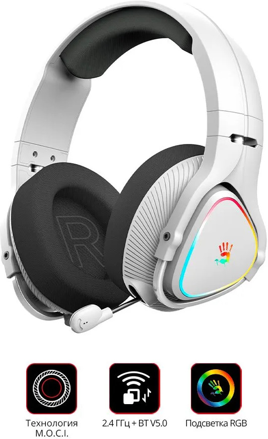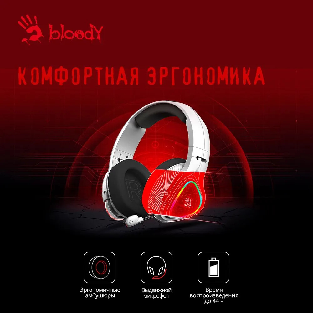 Геймерская стильная Bluetooth-стереогарнитура A4Tech Bloody MR710 с интегрированной RGB-подсветкой имеет выдвижной микрофон для передачи голоса пользователя. Наушники отличаются высокой емкостью встроенного аккумулятора, обеспечивающего до 44 ч работы при полном заряде. Для зарядки АКБ используется разъем USB Type-C.