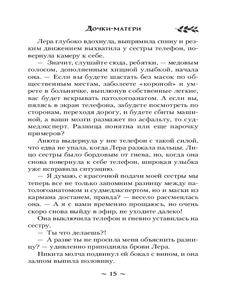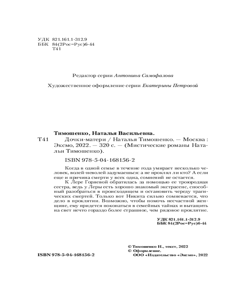 Дочки-материВ данный момент этот товар отсутствует в продаже. Возможно, у нас найдется аналогичный или похожий товар здесь. Прошлое раскрывает тайны. Когда в одной семье в течение года умирают несколько человек, волей-неволей задумаешься: а не проклял ли кто? А если еще и причина смерти у всех одна, сомнений не остается. К Лере Горяевой обратилась за помощью ее троюродная сестра, ведь у Леры есть хорошо знакомый экстрасенс, способный разобраться в происходящем и остановить череду трагических смертей. Только вот Никита сильно сомневается, что дело в проклятии. Возможно, чтобы помочь несчастной женщине, ему придется покопаться в семейных тайнах и вытащить на свет нечто гораздо более страшное, чем рядовое проклятие. Захватывающее детективное фэнтези, увлекающее с первой страницы. Романы Натальи Тимошенко пропитаны мистикой и тайной. В них оживают лесные чудовища, посланники из мира мертвых и старые добрые домовые. |