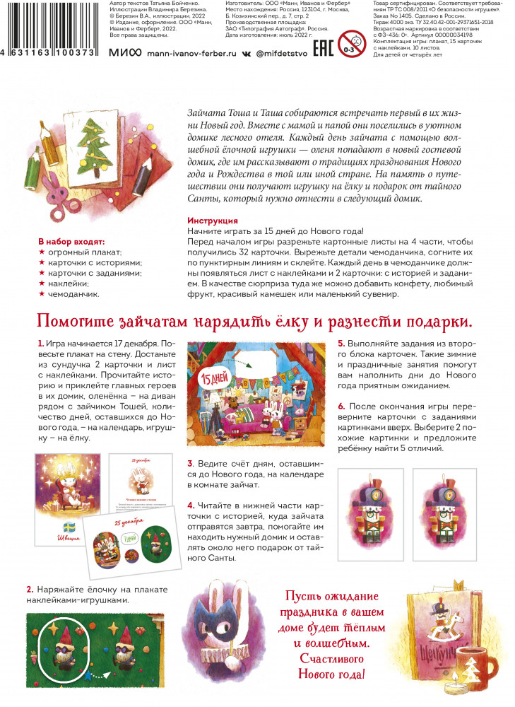 Адвент-путешествие «Как зайчата Новый год встречали»В данный момент этот товар отсутствует в продаже. Возможно, у нас найдется аналогичный или похожий товар здесь. Серия: В ожидании Нового года. Адвент-календари Чтобы ожидание Нового года не было грустным и утомительным, проведите 15 дней уходящего года вместе с увлекательным и уютным адвентом. Семья зайчиков решила встретить Новый год в домике лесного отеля, куда съехались их друзья из разных стран. Зайчатам Тоше и Таше выпало быть почтальонами тайного Санты. Каждый день они оказываются в новом домике иностранного гостя, дарят ему подарок и слушают историю о том, как встречают Новый год или Рождество в его стране. |