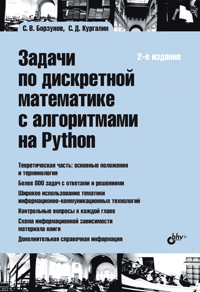Задачи по дискретной математике с алгоритмами на PythonСергей Викторович Борзунов, Сергей Дмитриевич Кургалин В данный момент этот товар отсутствует в продаже. Возможно, у нас найдется аналогичный или похожий товар здесь. В учебное пособие включены задачи и упражнения вузовского курса дискретной математики, включая разделы, связанные со спецификой информационно-коммуникационных технологий. В каждой главе приводятся теоретические сведения, необходимые для решения задач разного уровня сложности, ответы и во многих случаях подробные пояснения к решениям. |