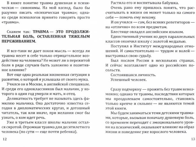 Книга психолога Натальи Кретовой «Психология детских травм» посвящена проработке детских травматических переживаний. В семи главах раскрываются основные принципы работы с психическими травмами, давними обидами и другими незабытыми тяжелыми ситуациями, оказавшими негативное влияние на дальнейшую жизнь. В книге представлены авторские медитации, положительно повлиявшие на людей, детство которых было омрачено событиями, угрожающими жизни, внезапным вынужденным переездом, потерей близких людей, разводом родителей, жестоким отношением окружающих и др. |