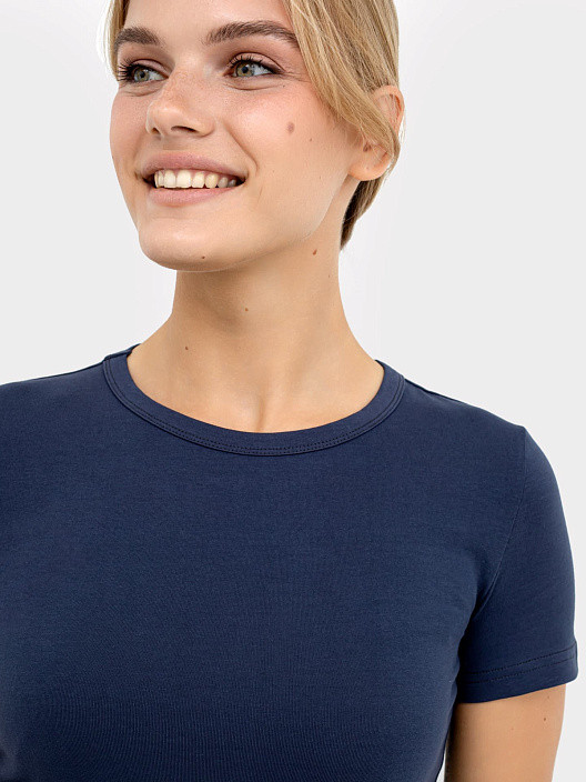 Прилегающая футболка из кулирного полотна. Горловина круглой формы. Рукава короткие. Универсальная футболка для спорта, прогулок и домашних дел.