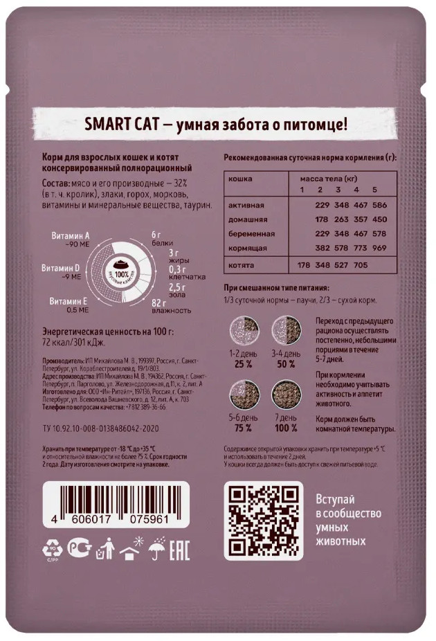 Smart Cat Корм для кошек с кусочками кролика и морковью