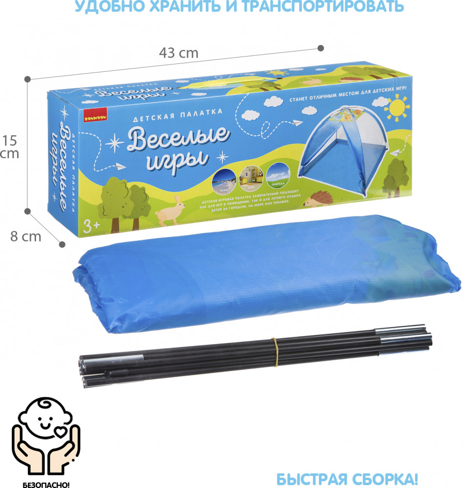 Bondibon Палатка игроваяВ данный момент этот товар отсутствует в продаже. Возможно, у нас найдется аналогичный или похожий товар здесь. Серия: Веселые игры Детская игровая палатка «Веселые игры» это лёгкая сборка и удобное, компактное хранение! Благодаря ее габаритам в сложенном виде ее удобно брать с собой для игр на природе, а материал палатки легко поддается чистке водой и щадящими моющими средствами. |