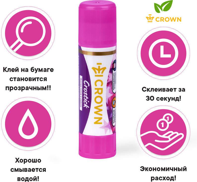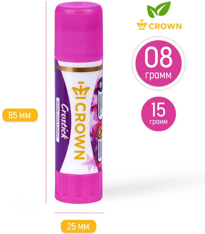 Crown Клей-карандаш «Indicator»удобство клейкость чёткость бесцветность сухой В данный момент этот товар отсутствует в продаже. Возможно, у нас найдется аналогичный или похожий товар здесь. Клей-карандаш. Клей содержит специальный цветной пигмент, поэтому след от карандаша хорошо виден при нанесении. По мере высыхания клея пигмент обесцвечивается. Предназначен для склеивания всех видов бумаг, картона, фотографий. Не токсичен, не содержит растворителей. Надежный колпачок предохраняет от высыхания. |