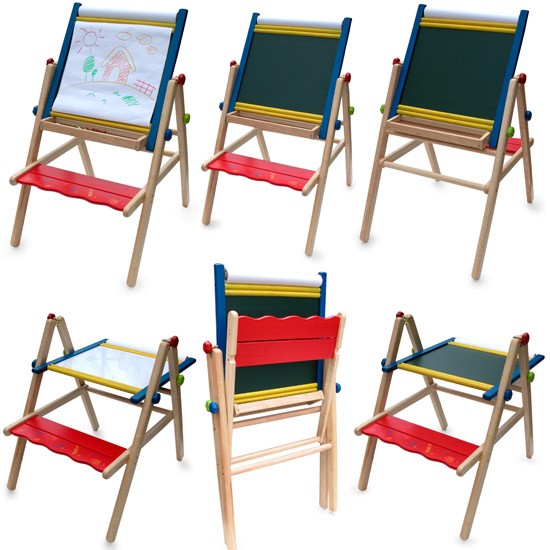 К услугам юных художников предоставляется мольберт, имеющий с одной стороны черную грифельную рабочую поверхность, а с другой – белую (470 х 390 мм). Грифельная сторона предназначена для рисования мелками, а на белой можно рисовать фломастерами. Если закрепить рулон бумаги, который приобретается отдельно, то можно рисовать чем угодно. Рабочая поверхность может устанавливаться как в вертикальное, так и в горизонтальное положение. Для хранения аксессуаров предусмотрена полочка. Ребенок может работать не только стоя, но и сидя, если выдвинуть скамеечку. Набор также преобразовывается в парту с двумя поверхностями столешницы.