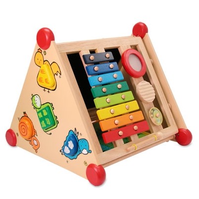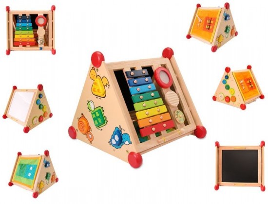 -1 сторона музыкальная (37х34 см) включает инструменты: ксилофон, барабан с палочкой, трещотку, цимбалы. Малыш с удовольствием играет на музыкальных инструментах, запоминает новые звуки и названия инструментов.