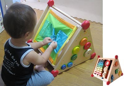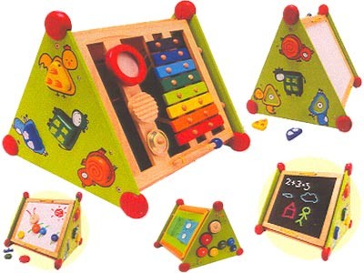 На 5 панелях игрового домика более 12 разнообразных увлекательных игр. Малыш играет на музыкальных инструментах, рисует мелками или фломастерами, играет с магнитиками, учится застегивать и расстегивать пуговицы, молнии, пряжки и знакомится со шнуровкой.