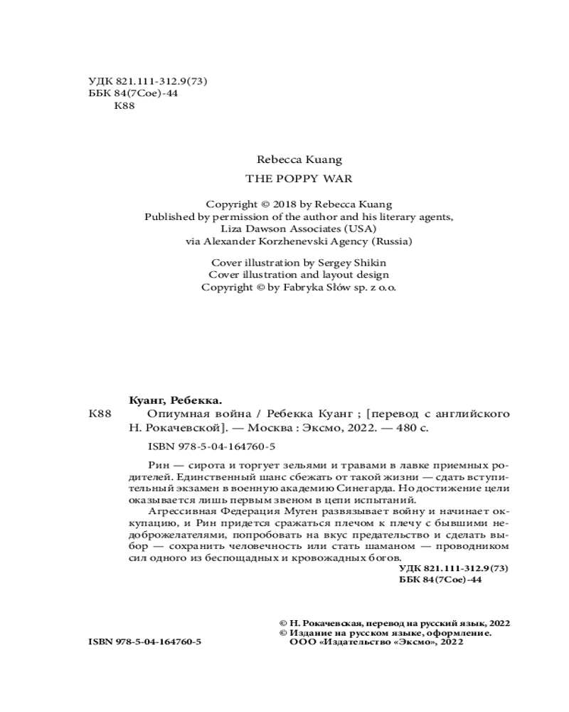 Опиумная войнаВ данный момент этот товар отсутствует в продаже. Возможно, у нас найдется аналогичный или похожий товар здесь. Рин — сирота и торгует зельями и травами в лавке приемных родителей. Единственный шанс сбежать от такой жизни — сдать вступительный экзамен в военную академию Синегарда. Но достижение цели оказывается лишь первым звеном в цепи испытаний. |