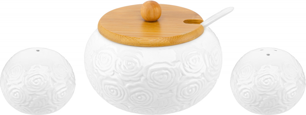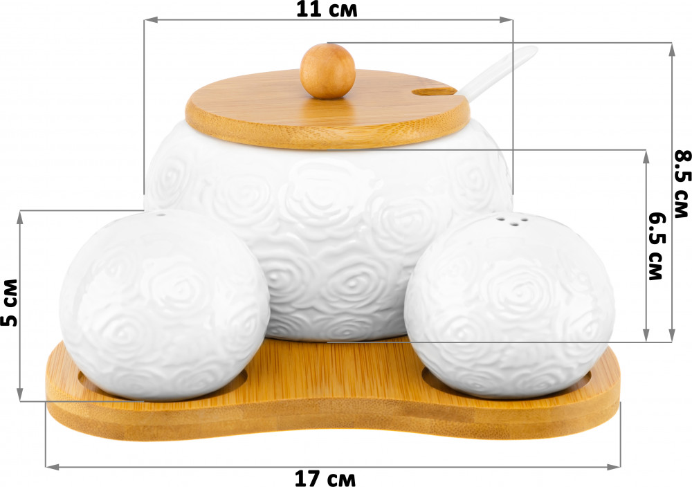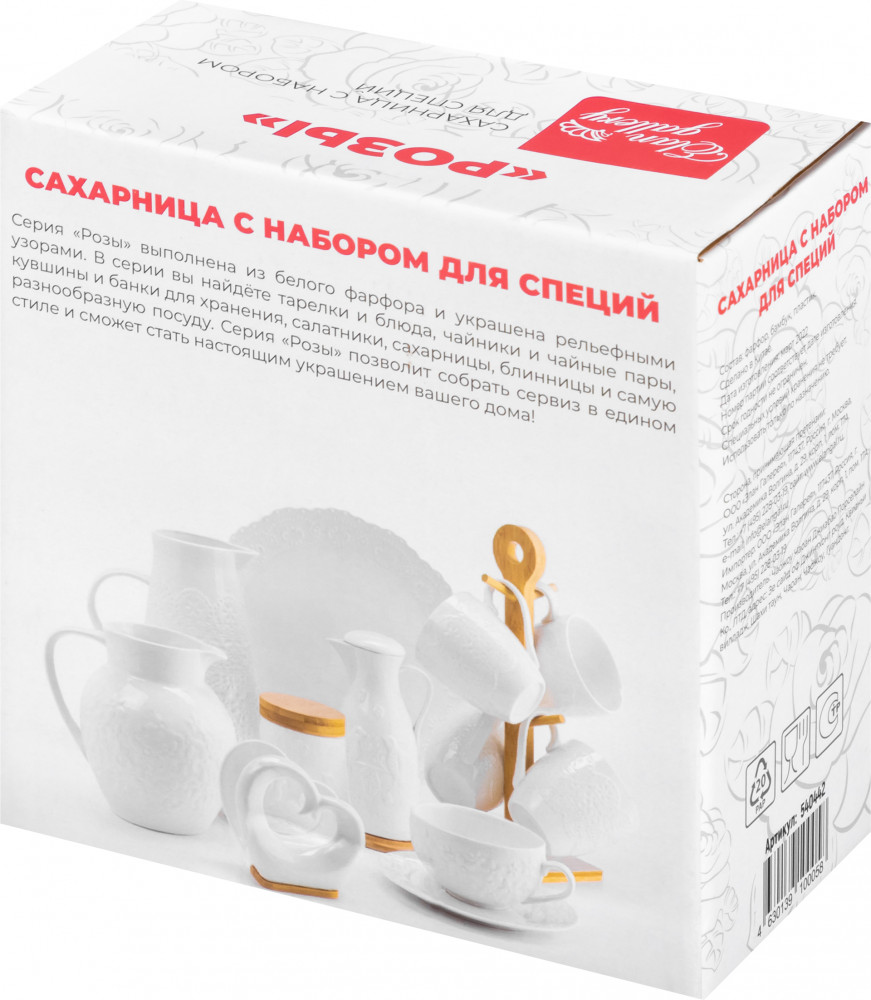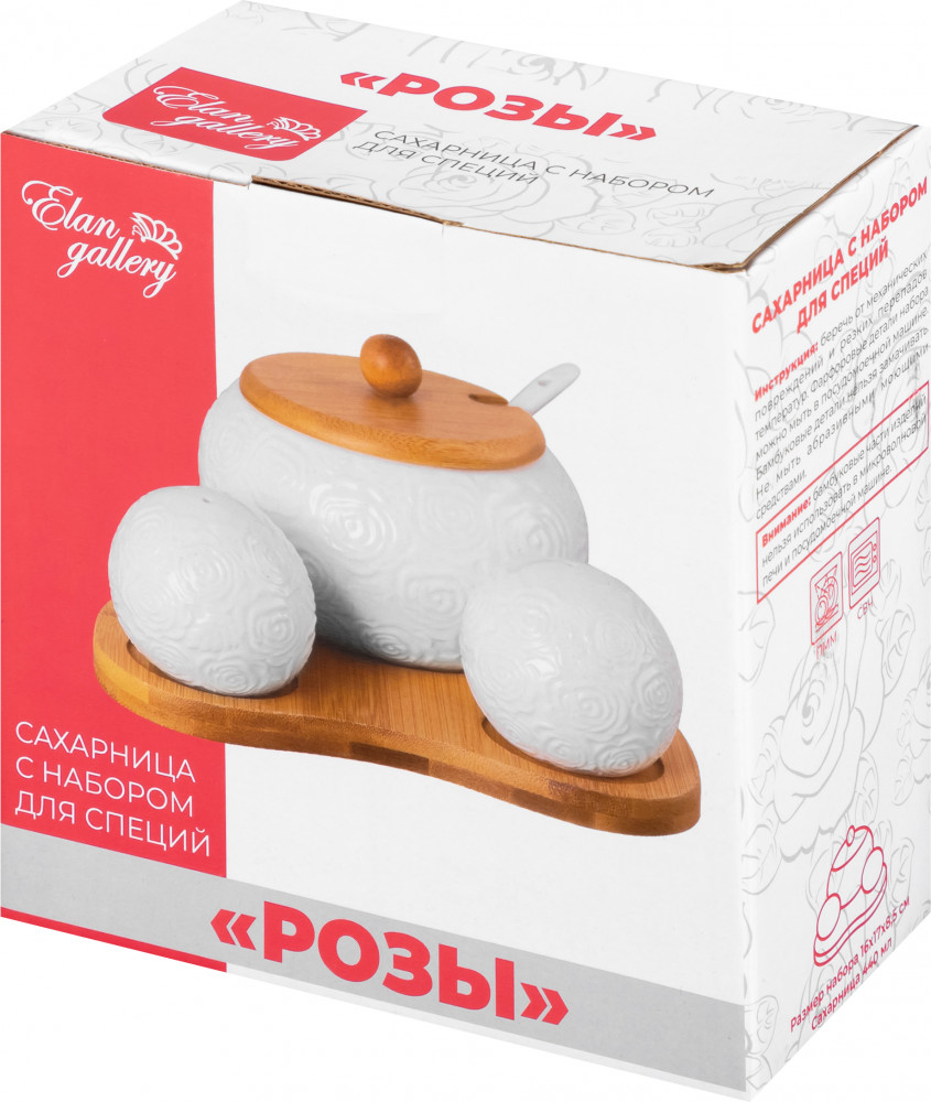 Elan Gallery Сахарница с набором для специй «Розы»внешний вид набор качество В данный момент этот товар отсутствует в продаже. Возможно, у нас найдется аналогичный или похожий товар здесь. Серия: Розы Набор для специй серии посуды «Розы». Органайзер украсит каждодневный обеденный стол и эстетично дополнит интерьер на праздник. Кухонные банки выполнены из высококачественного белого фарфора, который отличается от керамики повышенной плотностью. Изделия из фарфора не впитывают цвет и не деформируются от влаги, чему может быть подвержена керамическая посуда. Контейнеры можно наполнить через отверстия снизу, закрытые пластиковыми пробками. Фарфоровые детали набора можно использовать в ПММ (посудомоечной машине). Бамбук нельзя замачивать. |