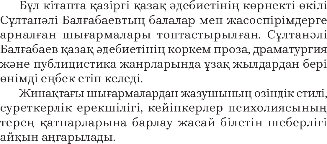 💳 Оплатить за товар можно при получении 🇰🇿 Есть бесплатная доставка по Казахстану от 1 дня 🎁 Копите бонусы с каждой покупки Бұл кітапта қазіргі қазақ әдебиетінің көрнекті өкілі Сұлтанәлі Балғабаевтың балалар мен жасөспірімдерге арналған шығармалары топтастырылған. Сұлтанәлі Балғабаев қазақ әдебиетінің көркем проза, драматургия және публицистика жанрларында ұзақ жылдардан бері өнімді еңбек етіп келеді. Жинақтағы шығармалардан жазушының өзіндік стилі, суреткерлік ерекшелігі, кейіпкер психологиясының терең қатпарларына барлау жасай білетін шеберлігі айқын аңғарылады. |