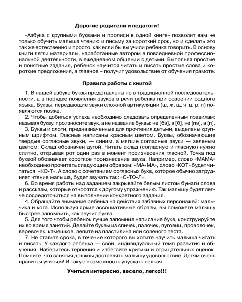 💳 Оплатить за товар можно при получении 🇰🇿 Есть бесплатная доставка по Казахстану от 1 дня 🎁 Копите бонусы с каждой покупки Серия: Учимся с Олесей Жуковой Эта азбука станет незаменимым помощником для родителей и педагогов, которые хотят помочь своему малышу поскорее научится читать и писать. Крупные буквы и простые увлекательные задания облегчат ребенку освоение новых навыков, а яркие картинки и веселые рассказы превратят уроки чтения и письма в любимую игру. |