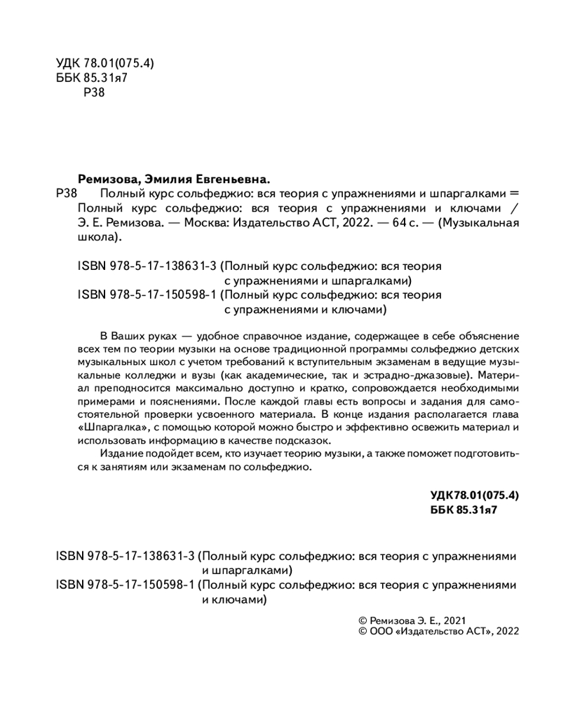 Полный курс сольфеджио. Вся теория с упражнениями и ключамиВ данный момент этот товар отсутствует в продаже. Возможно, у нас найдется аналогичный или похожий товар здесь. Серия: Музыкальная школа «Полный курс сольфеджио: вся теория с упражнениями и шпаргалками» — удобное справочное издание, содержащее в себе объяснение всех тем по теории музыки на основе традиционной программы сольфеджио детских музыкальных школ с учетом требований к вступительным экзаменам в ведущие музыкальные колледжи и ВУЗы (как академические, так и эстрадно-джазовые). |