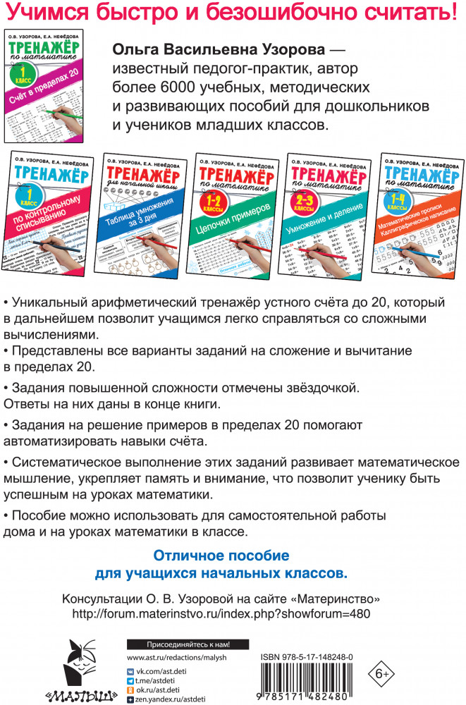 💳 Оплатить за товар можно при получении 🇰🇿 Есть бесплатная доставка по Казахстану от 1 дня 🎁 Копите бонусы с каждой покупки Серия: Тренажер для начальной школы Пособие «Цифры и счёт в пределах 20.Тренажер по математике 1 класс» разработано известными педагогами-практиками О. В. Узоровой и Е. А. Нефёдовой, авторами более 700 учебных пособий для начальной школы. |
