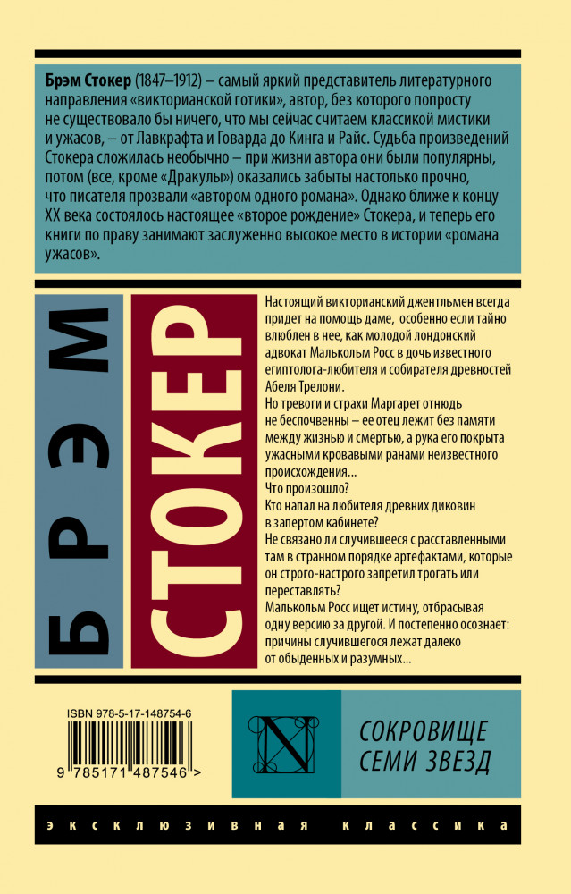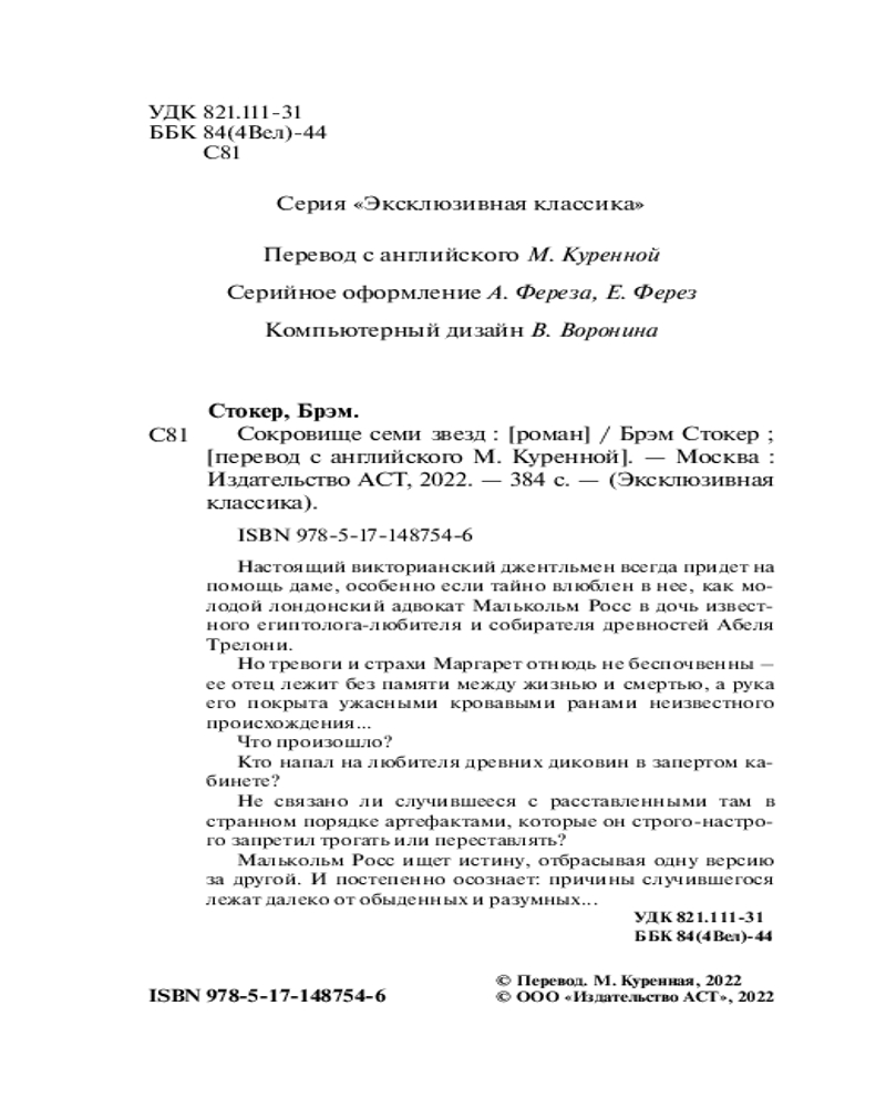 Книга удобного формата, пришла быстро. Касательно сюжета - интересно написано про египтологию, мумий, с налетом фантастики. Повествование ведется от автора - он видит себя в этом произведении адвокатом. Мне понравился слог, которым автор пишет - культурно, с пиететом. Присутствуют много разных героев, но в итоге они все оказываются второстепенными. Понравилось, что есть 2 концовки (но меня не устроила ни одна))))) Для ознакомления с творчеством Б.Стокера (автора "не одного романа") обязательно.