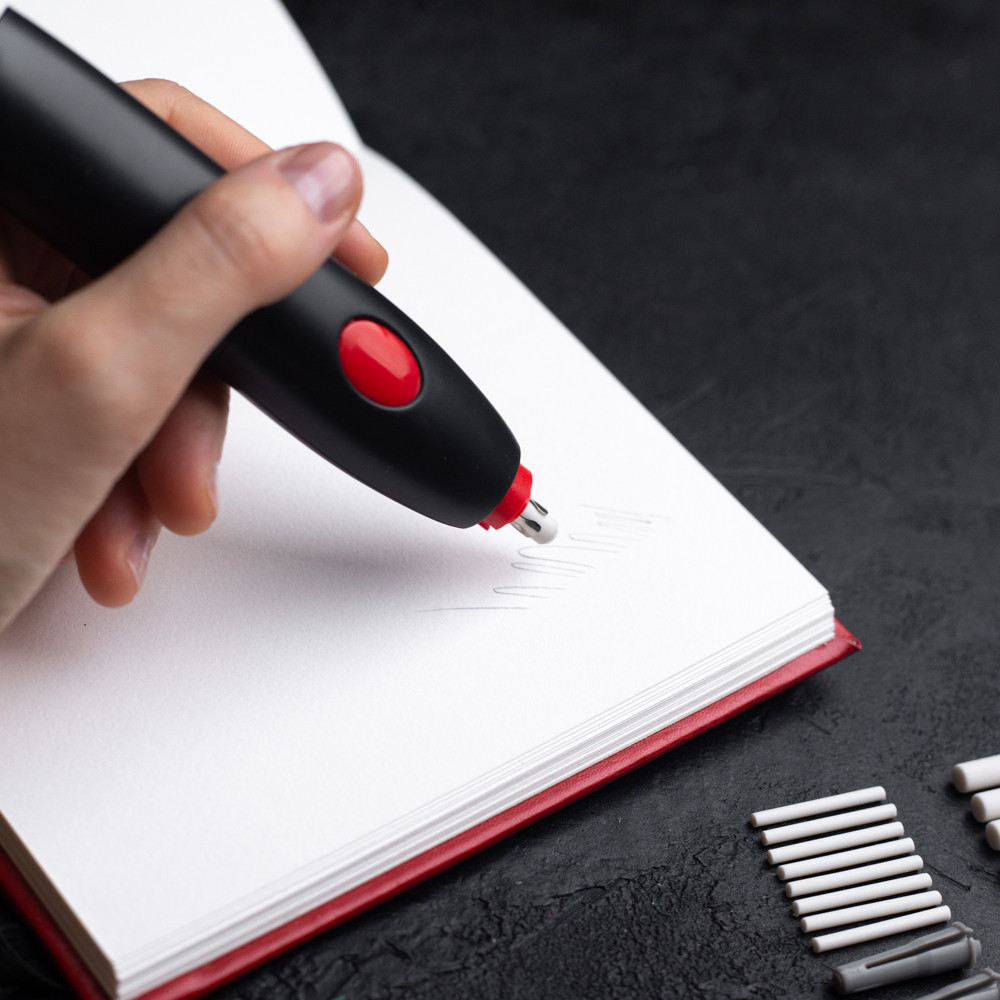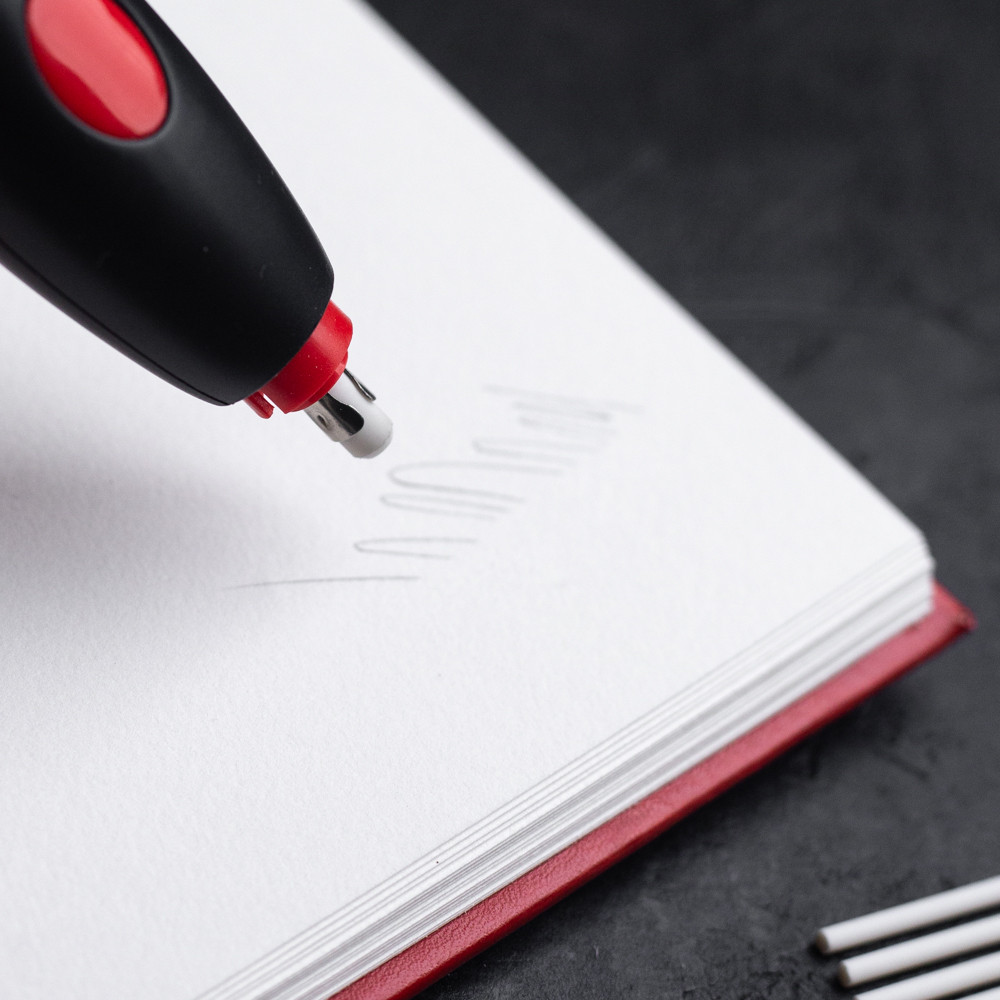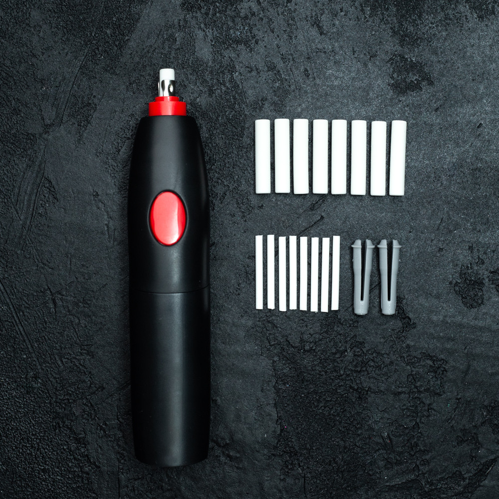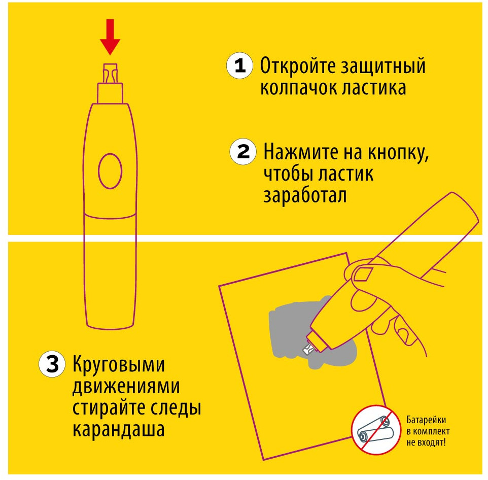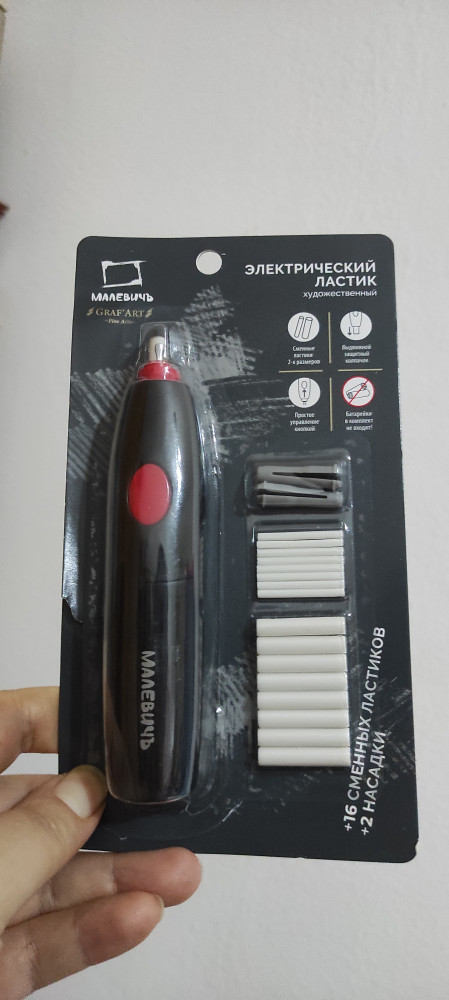 Хороший ластик. Удобно ложится в руку. Работает на мизинчиковых батарейках, при работе жужжит😆. Есть дополнительные сменные ластики двух размеров. Рекомендуюк покупке.