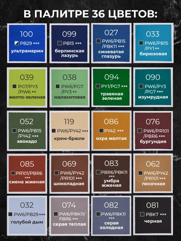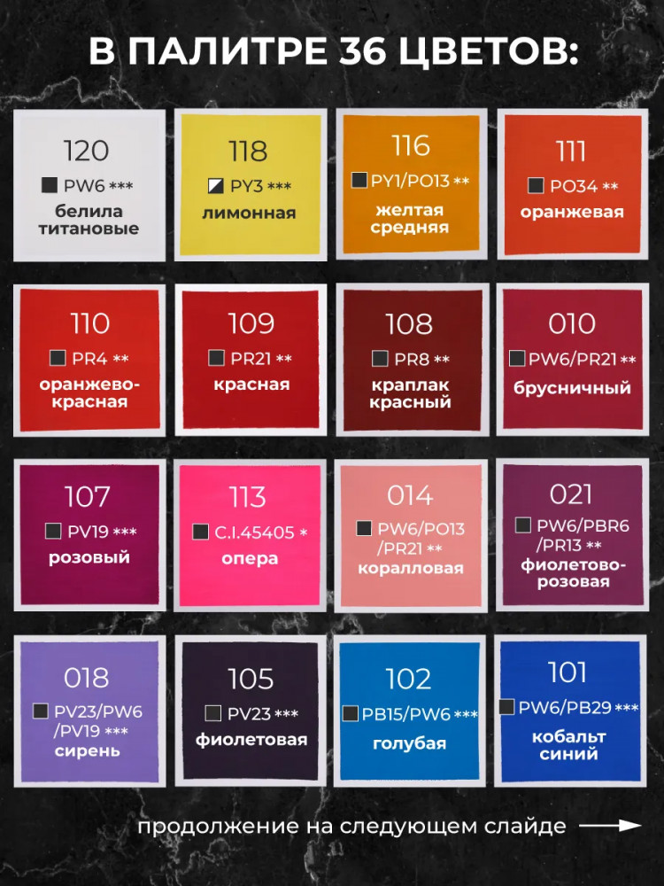 💳 Оплатить за товар можно при получении 🇰🇿 Есть бесплатная доставка по Казахстану от 1 дня 🎁 Копите бонусы с каждой покупки Гуашь художественная «Малевичъ» — водорастворимая, комфортная для работы краска с приятной кремовой консистенцией и повышенной концентрацией пигмента. Высокая кроющая способность позволяет наносить четкие мелкие непрозрачные детали светлых тонов на фон темного оттенка. Рисунки гуашью после высыхания приобретают бархатисто-матовую поверхность. Краска быстро сохнет, надолго сохраняет яркий и насыщенный цвет. Набор подходит как для начинающих, так и для профессиональных иллюстраторов. Гуашь изготовлена на основе растительного клея-гуммиарабика и пигментов высокого класса. |