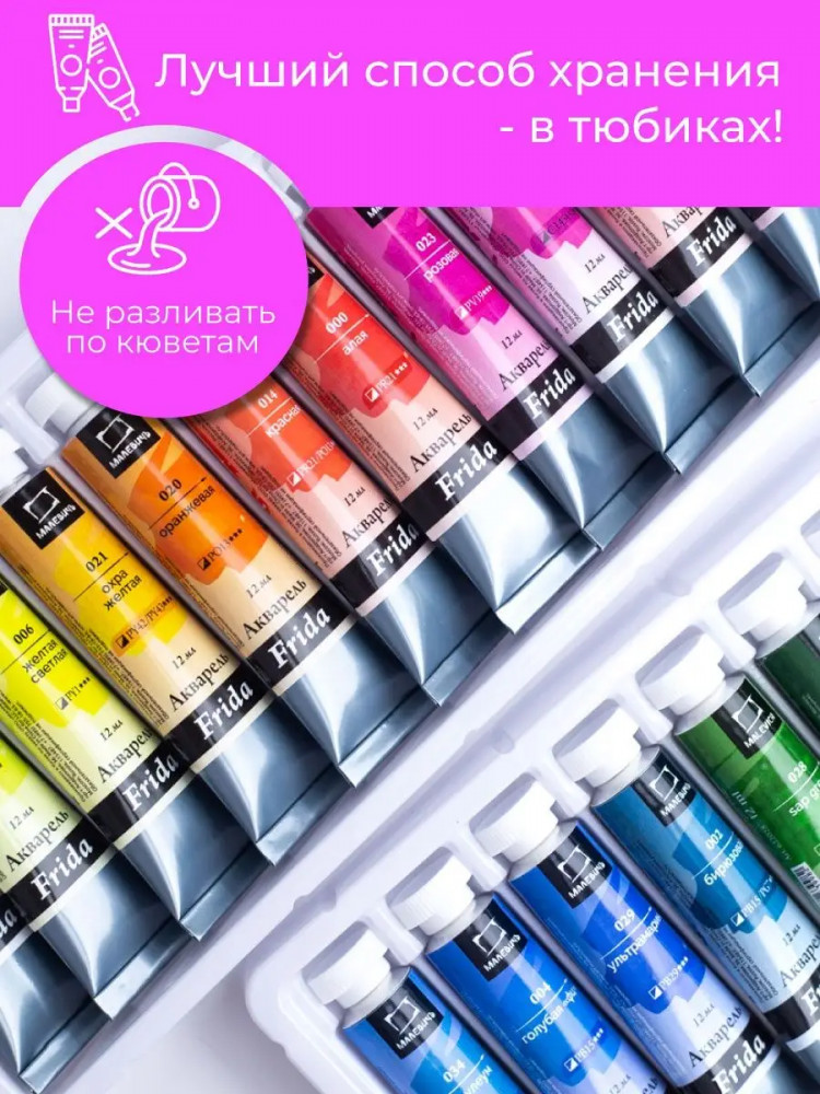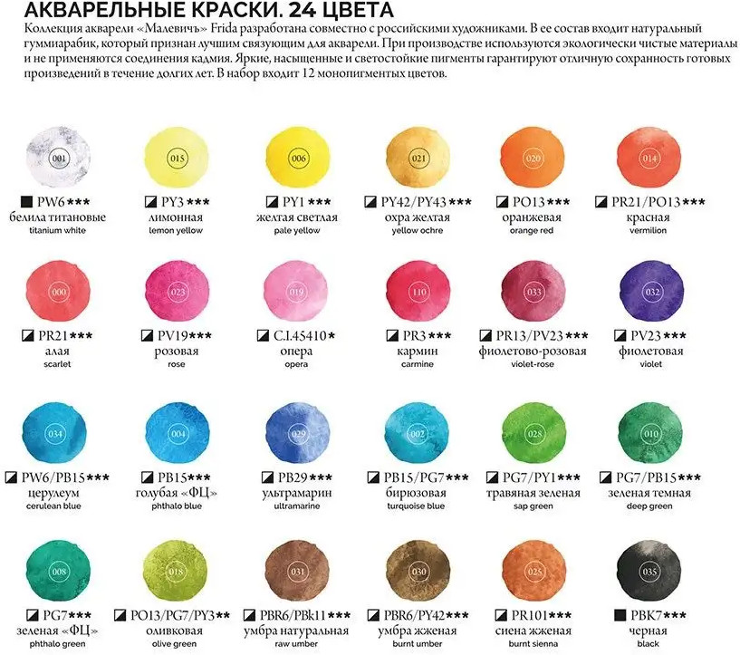 💳 Оплатить за товар можно при получении 🇰🇿 Есть бесплатная доставка по Казахстану 🎁 Копите бонусы с каждой покупки Серия: Frida Коллекция акварели «Малевичъ» разработана совместно с российскими художниками. В её состав входит натуральный гуммиарабик, который признан лучшим связующим для акварели. При производстве используются экологически чистые материалы. Яркие, насыщенные и светостойкие пигменты гарантируют отличную сохранность готовых работ. Не используются кадмий и сырье животного происхождения (акварель подходит для веганов и вегетарианцев). Акварель относится к классу сухих и не содержит пластификаторов животного или химического происхождения. Не рекомендуется для разлива по кюветам. |