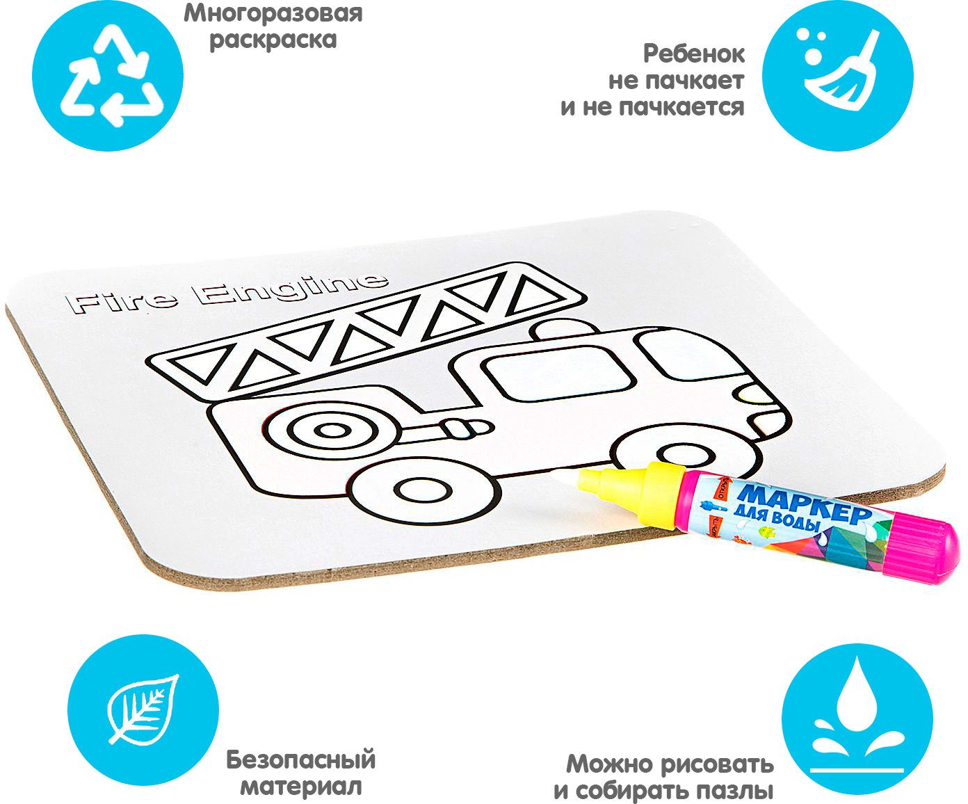 💳 Оплатить за товар можно при получении 🇰🇿 Есть бесплатная доставка по Казахстану от 1 дня 🎁 Копите бонусы с каждой покупки Серия: Baby You Многоразовая водная раскраска-пазл — замечательный набор 2 в 1. Водная раскраска послужит увлекательным занятием для юных начинающих художников, даже для тех, кто еще совсем не умеет рисовать. Достаточно наполнить ручку водой и провести по стороне раскраске, и картинка, как по волшебству, начнет проявляться различными цветами. После высыхания картинка опять становится бесцветной, и ребенок снова может творить. После рисования можно перевернуть картинку на другую сторону и собрать пазл. |
