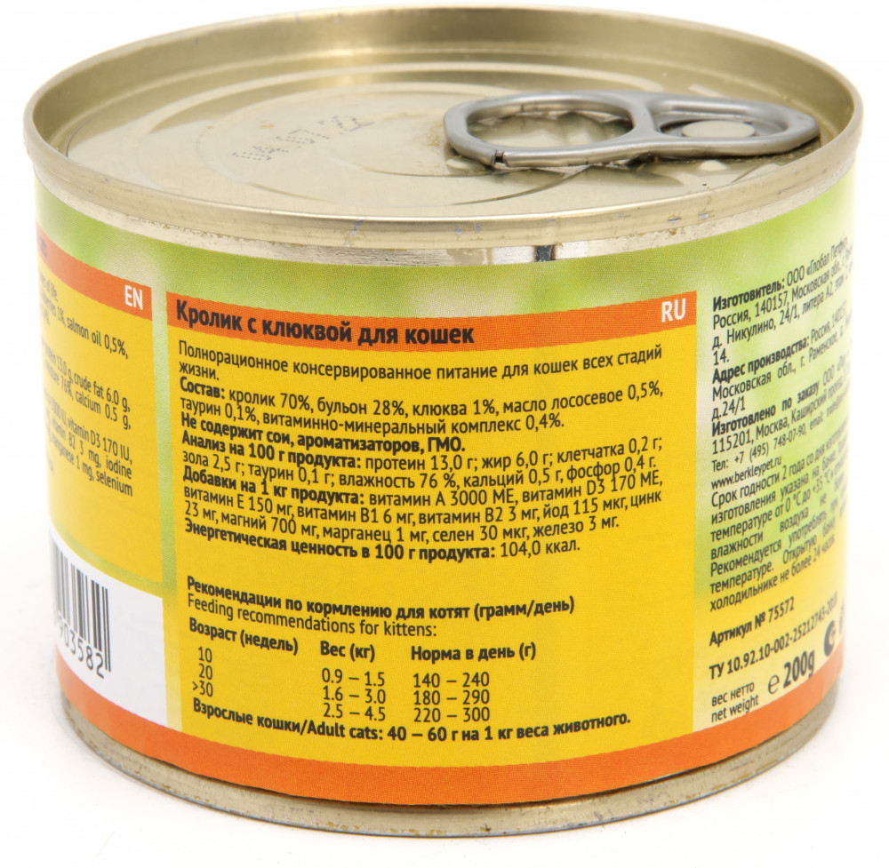 Отзывы «Консервы для кошек «Кролик с клюквой»»