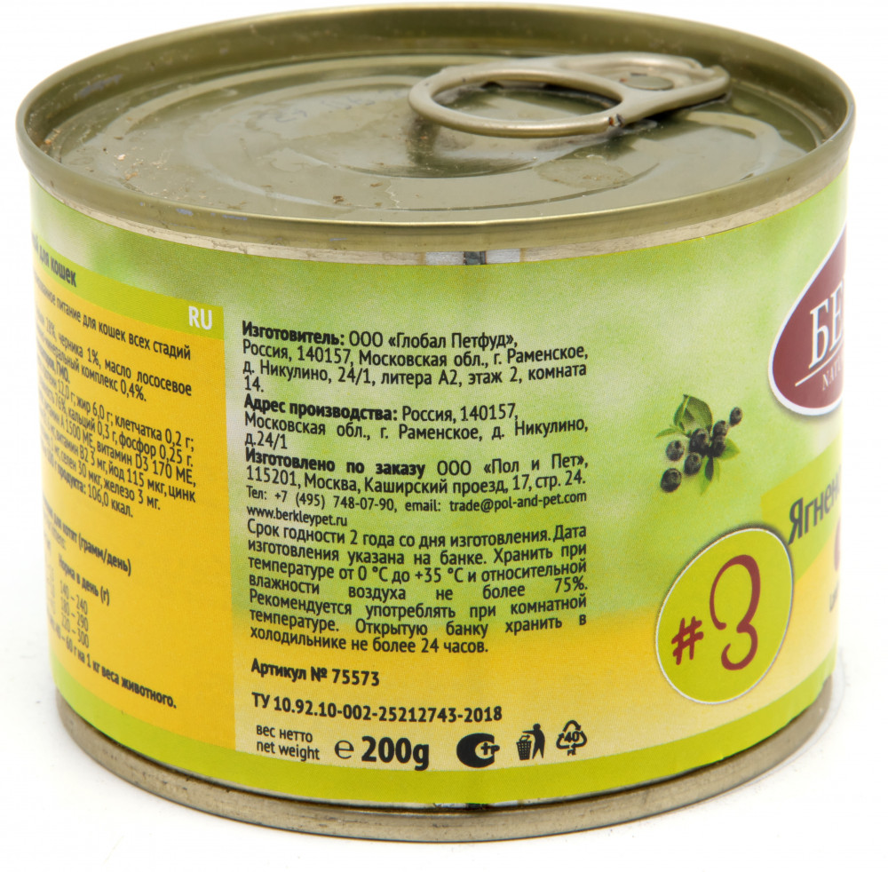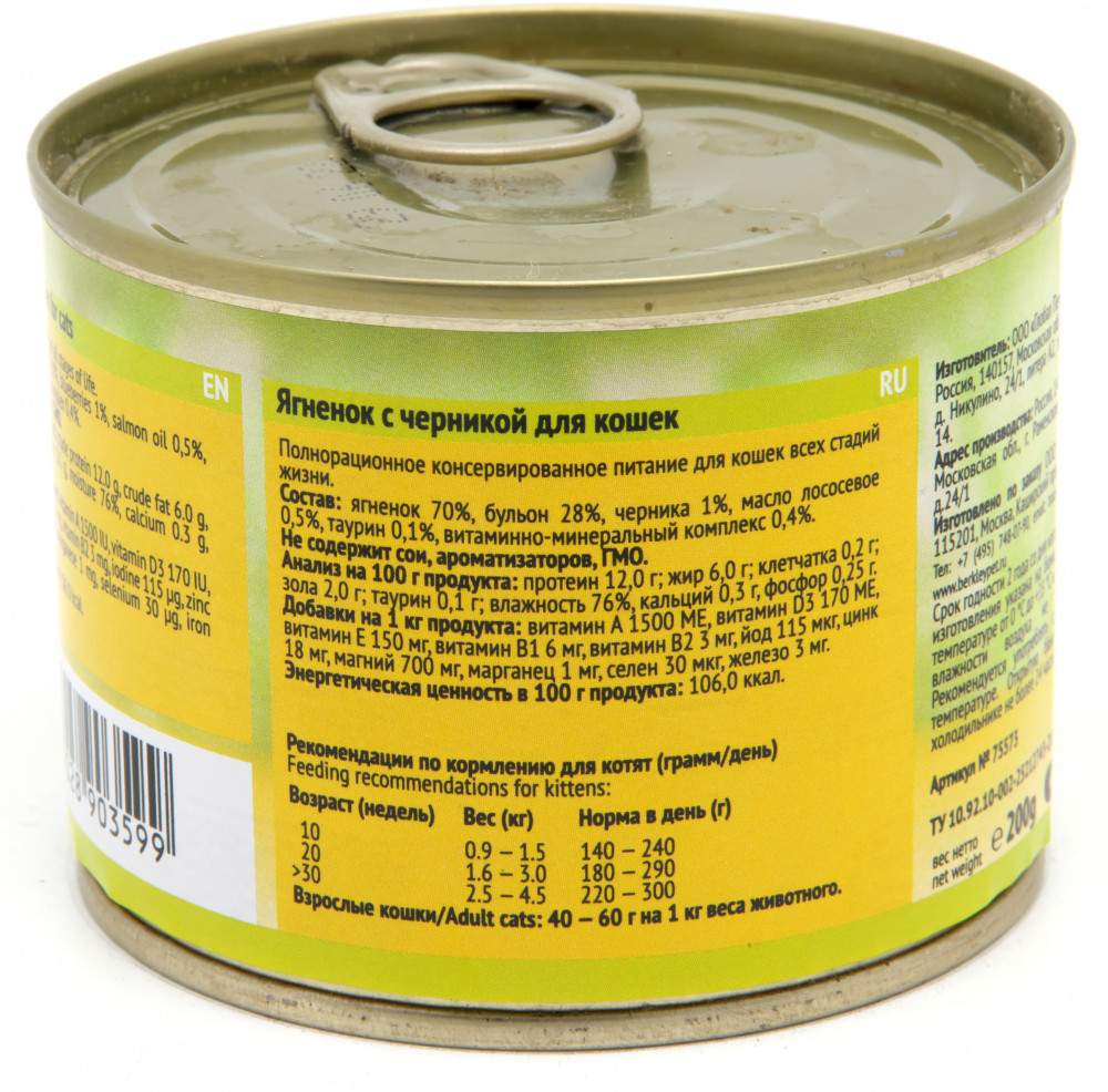 Отзывы «Консервы для кошек «Ягненок с черникой»»
