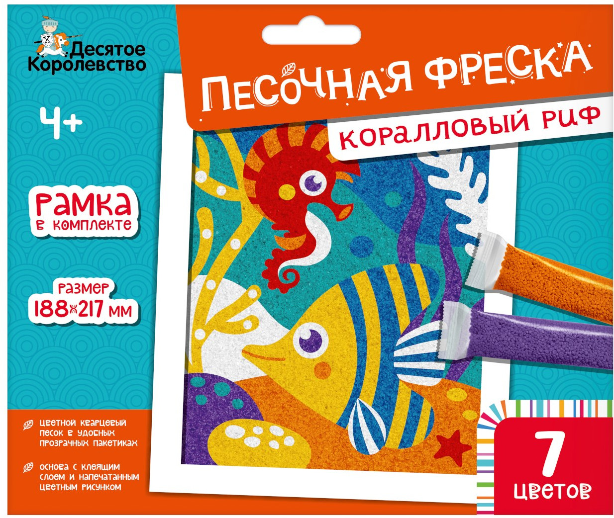 • кварцевый песок в прозрачных пакетиках — 7 шт. (бирюзовый, синий, фиолетовый, оранжевый, красный, желтый, белый).